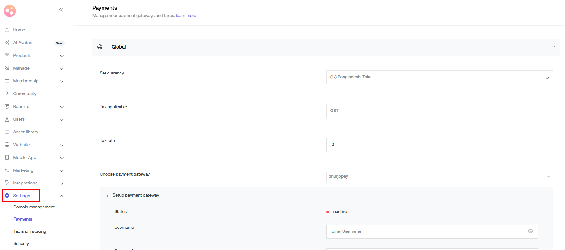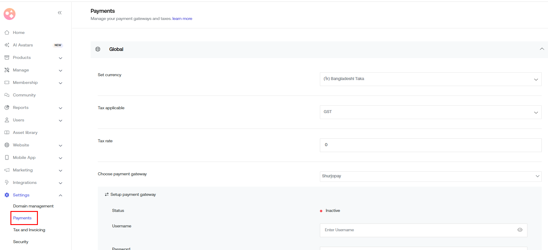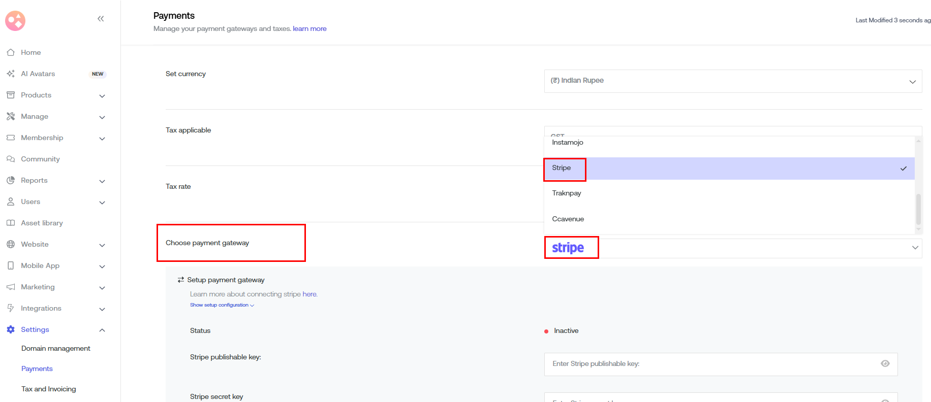 Ensure the desired currency is selected and choose the payment gateway as Stripe.