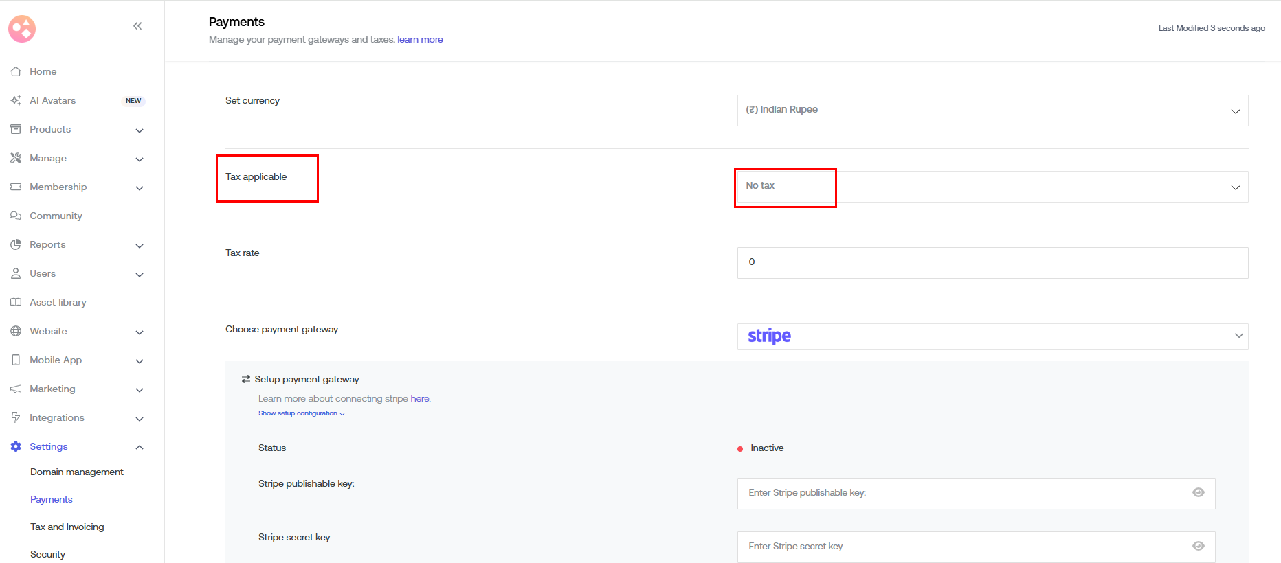 Step 4: Check that Stripe is active and Tax applicable is selected as No Tax.