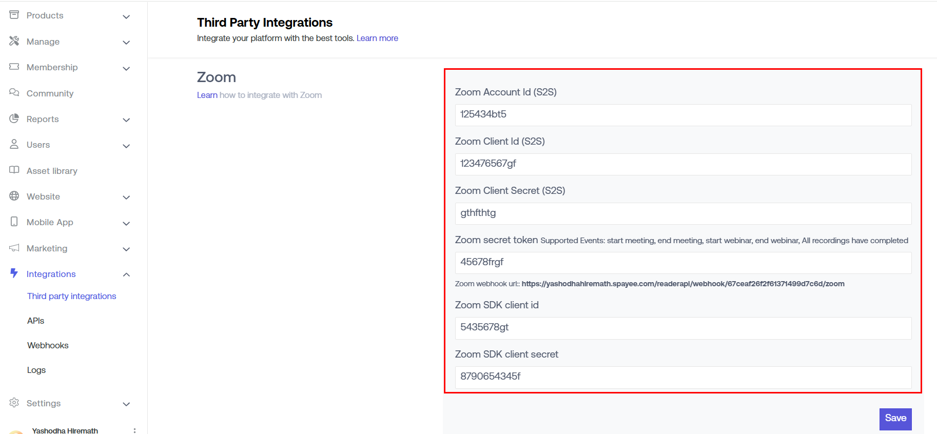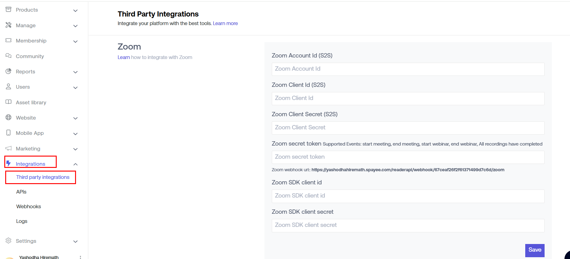 Step 10: Log in to your Seekhly account. Navigate to the 'Integration' > 'Third-party integrations' and scroll down to 'Zoom'. You have already added values for the first 4 fields.