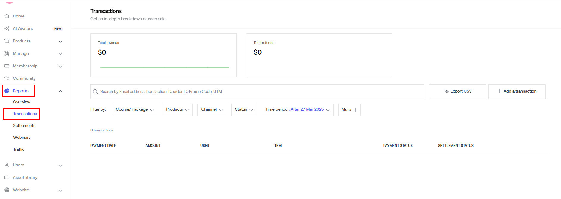 - As an admin, go to Reports > Transactions in the Seekhly Dashboard to check if the payment has been recorded.