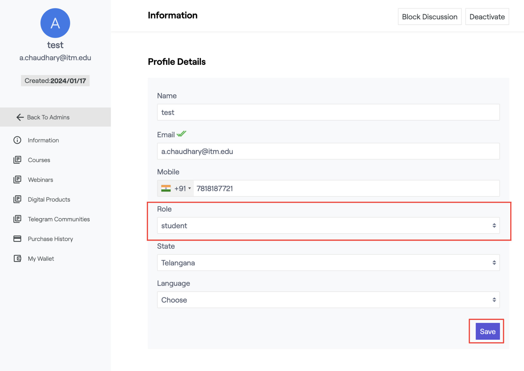 3. Change its role from Admin to Student.