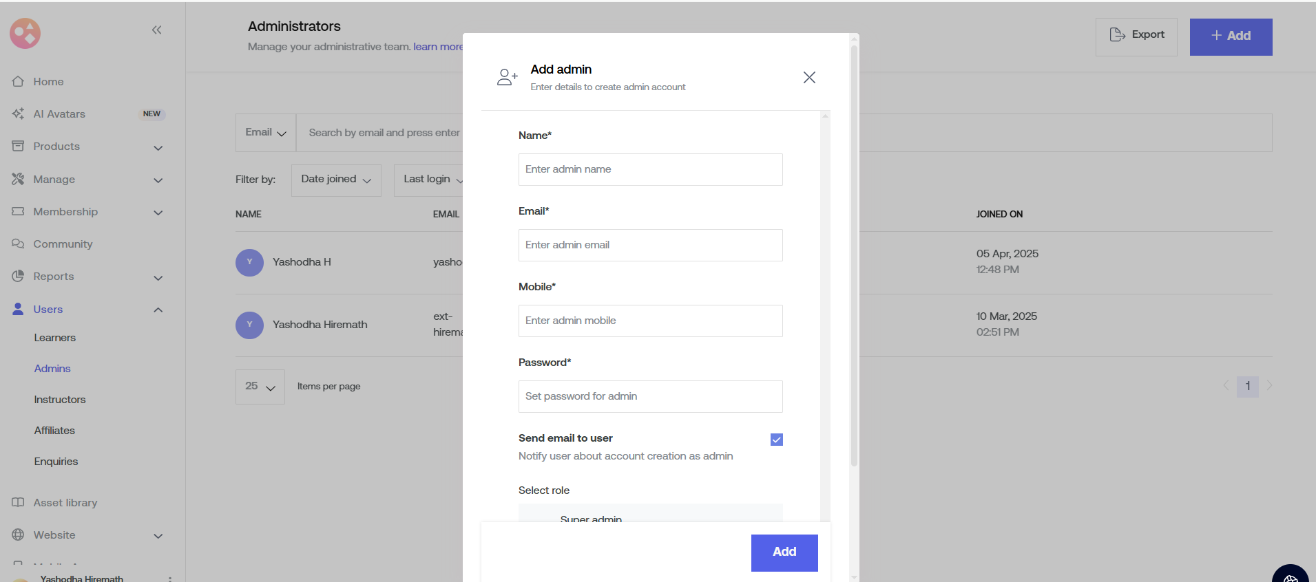5. Enter the details with the new email ID and assign admin access.