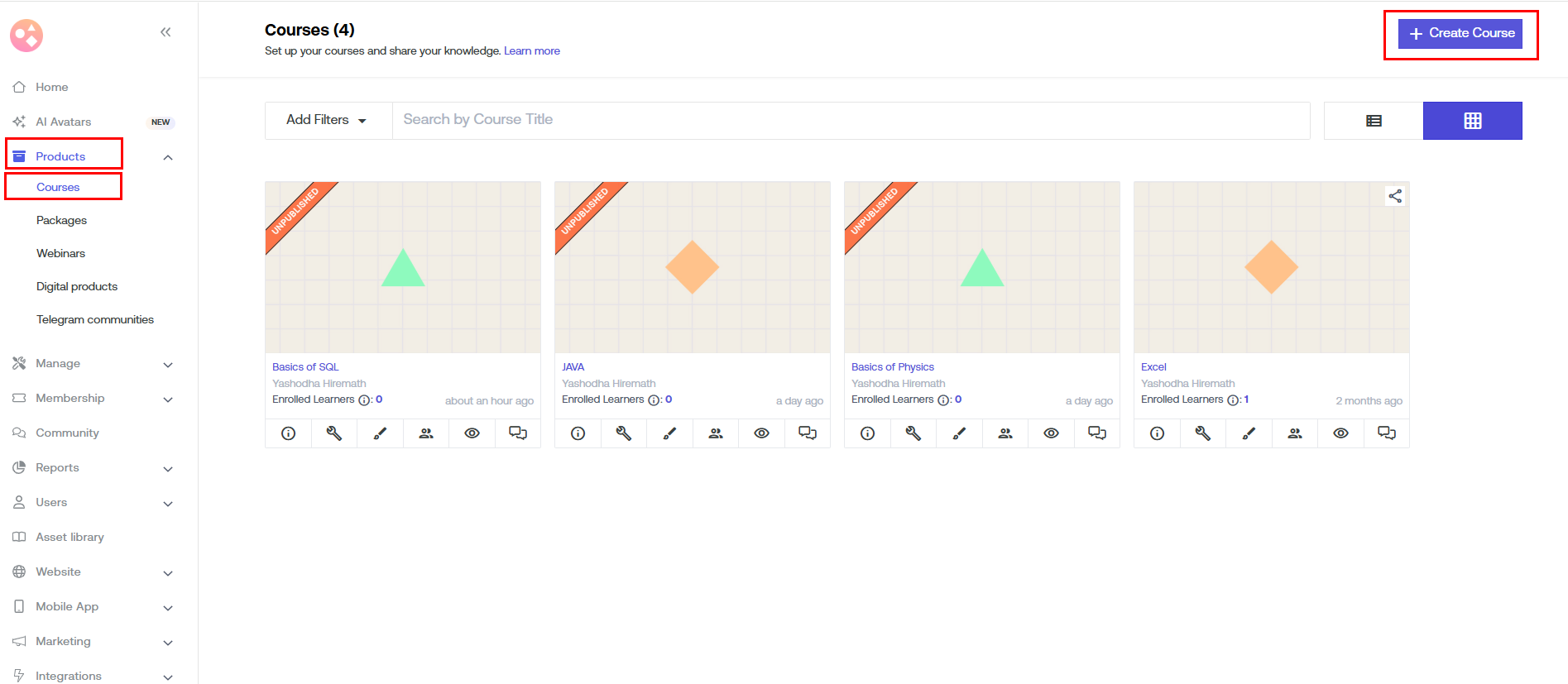 Click on "Create Course" and enter the course title and description.