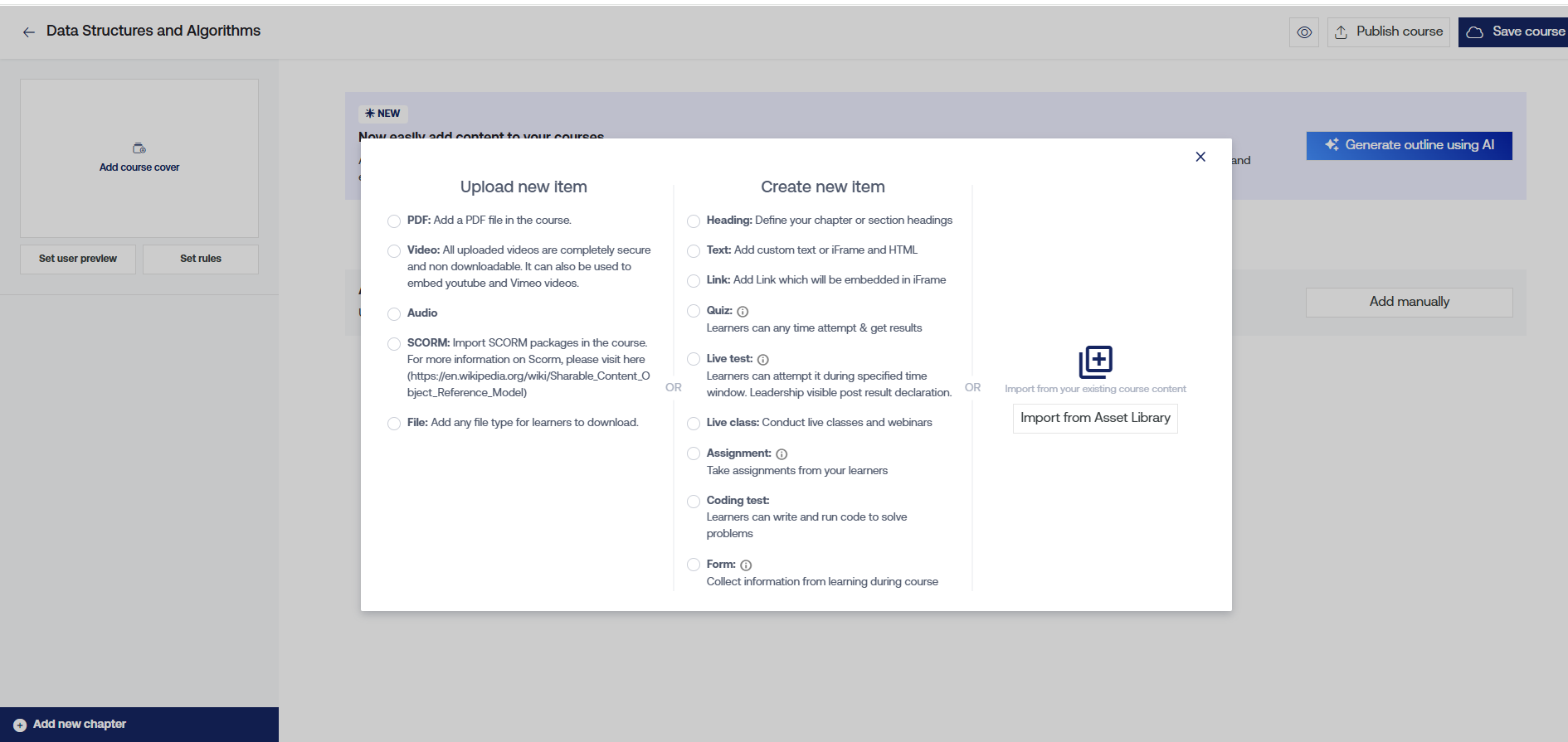 Upload videos, PDFs, quizzes, and other learning materials.
