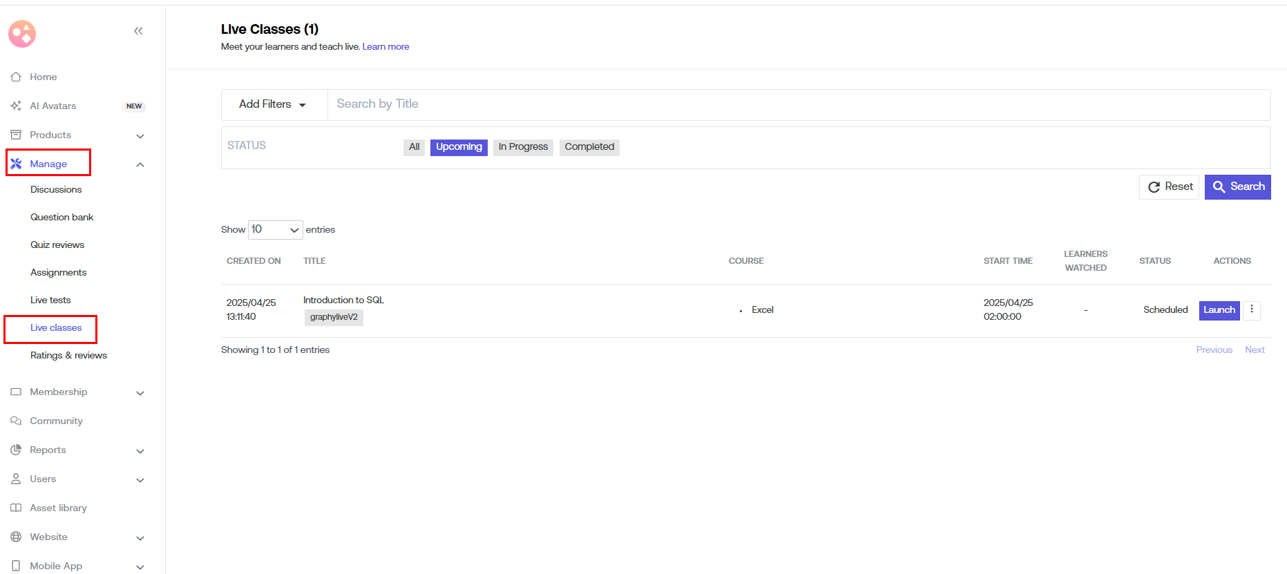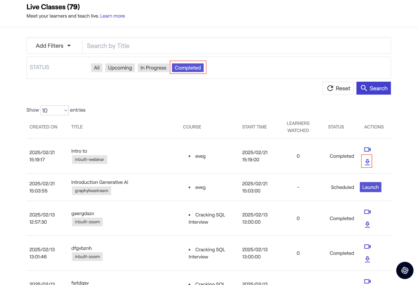 - Go to the “Live Classes” or “Recordings” section where past live sessions are stored.