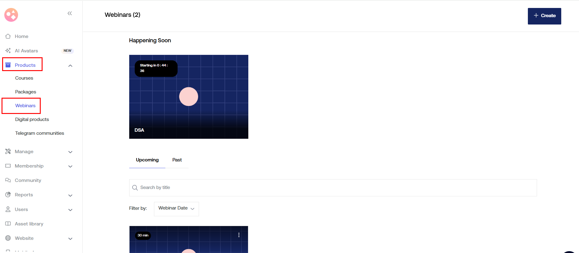 2. Navigate to the Webinars section ( you can find this by going to Dashboard > Products > Webinars).