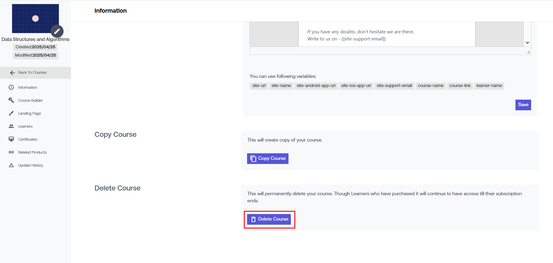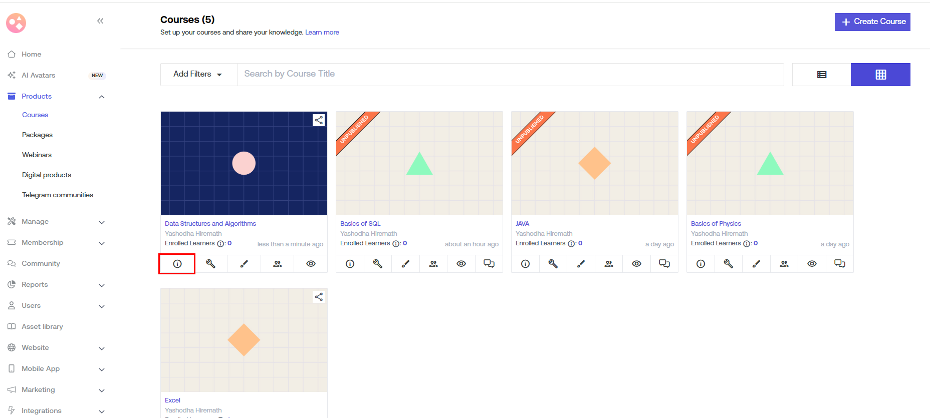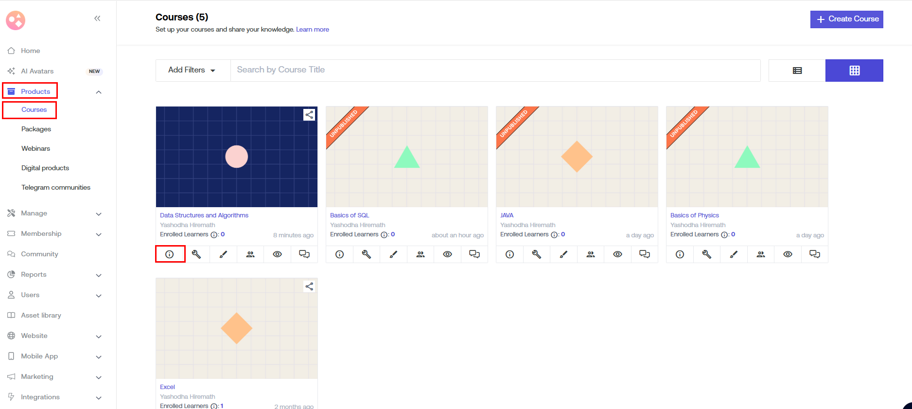 Note : If you have learners enrolled in a particular course you want to delete, and you dont want the learners to access the course after deletion of the course, first remove the learner from the course and then proceed to delete.