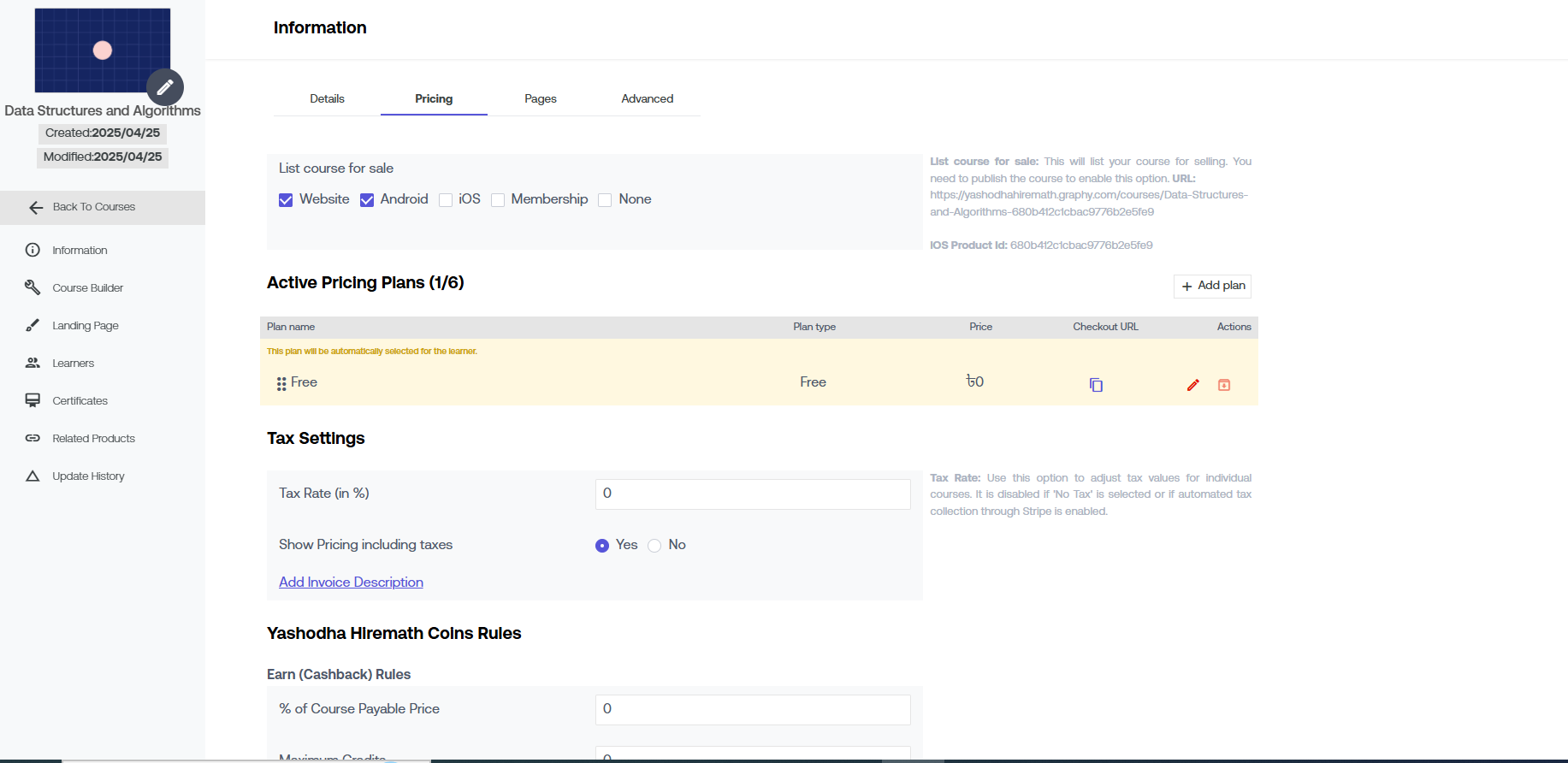 2. Go to "Pricing" , and from the "List course for sale" untick all the options.