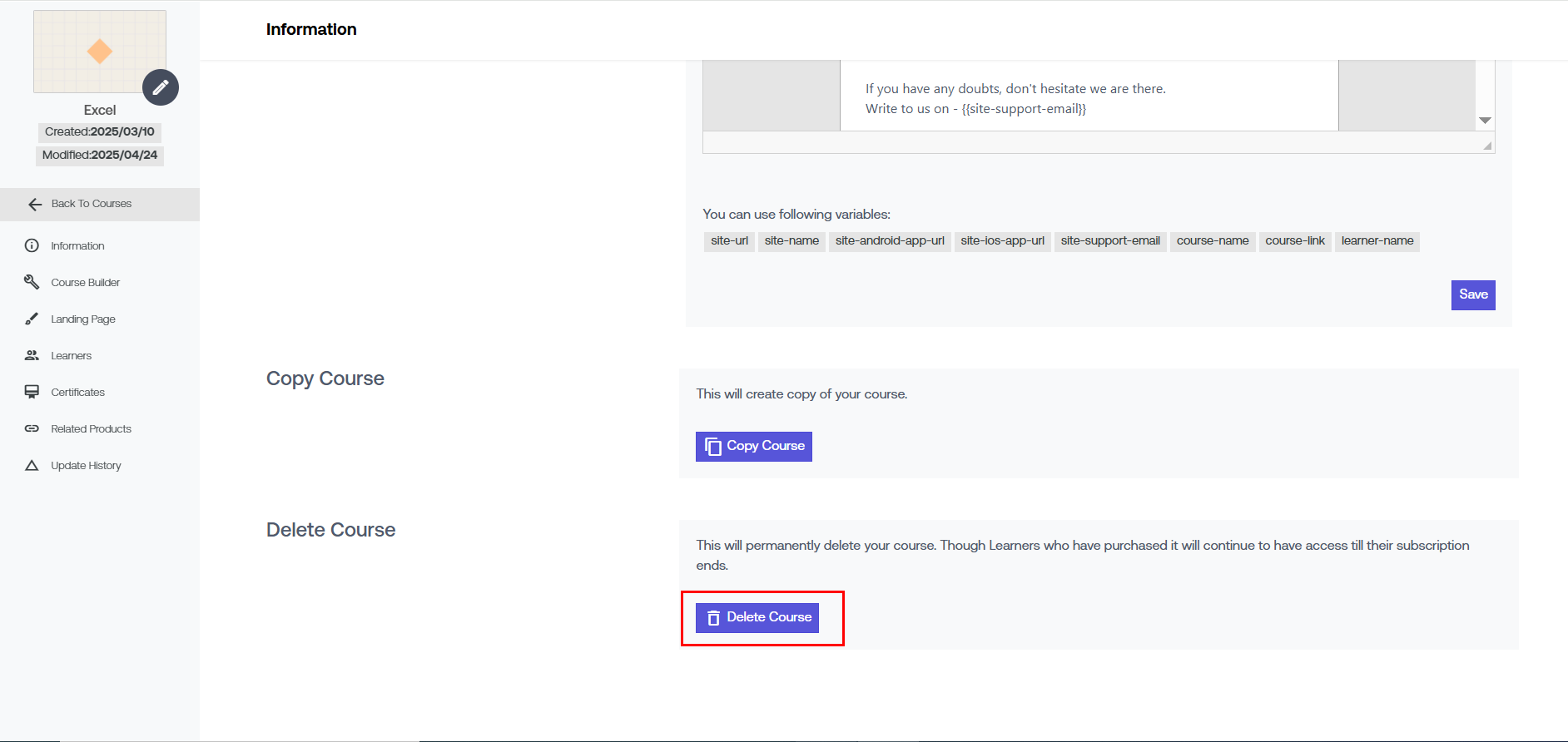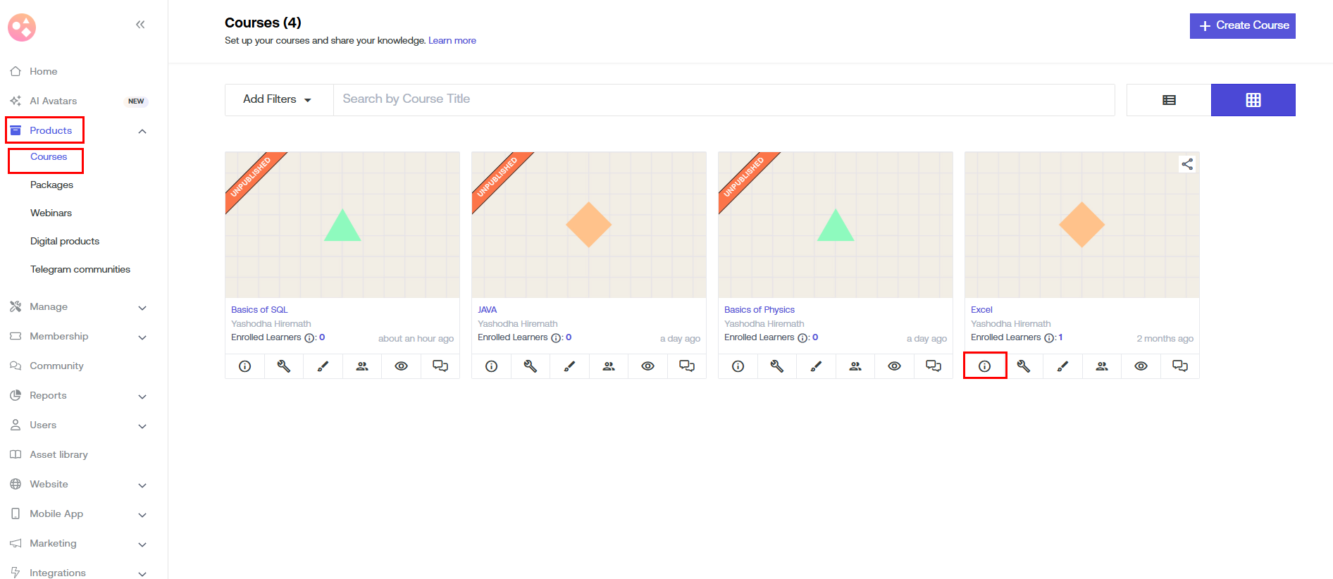 Note : If you have learners enrolled in a particular course you want to delete, and you dont want the learners to access the course after deletion of the course, first remove the learner from the course and then proceed to delete.