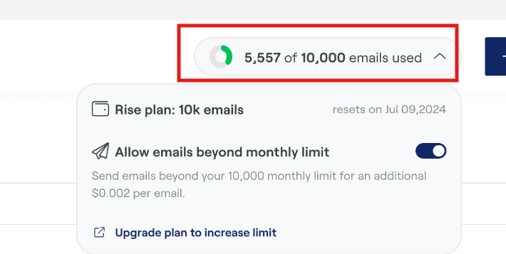 Your current email limit is displayed as a visual progress , showing the number of emails used versus the total allowed in your current plan, allowing you to easily track your usage and plan accordingly.