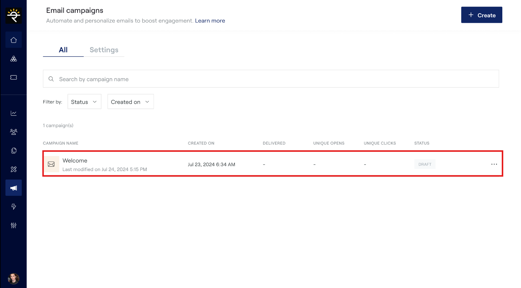 - You can check the default campaign on the listing page for reference or create a new campaign by clicking on 'Create'.