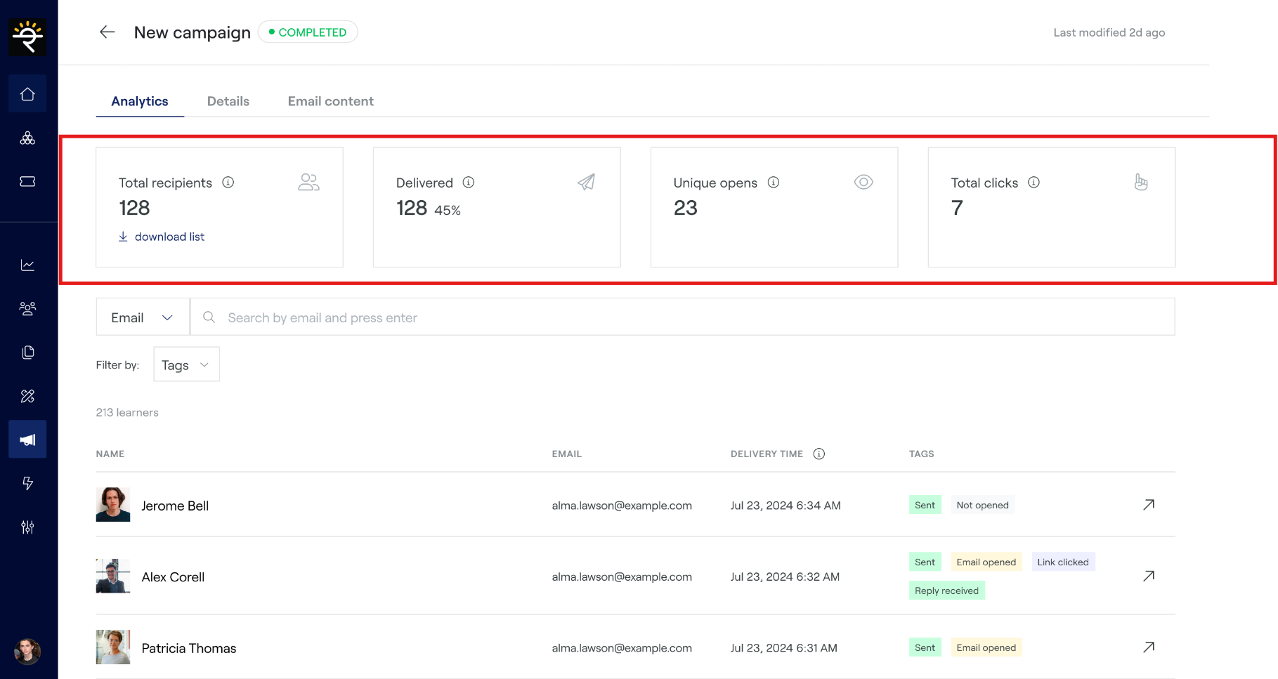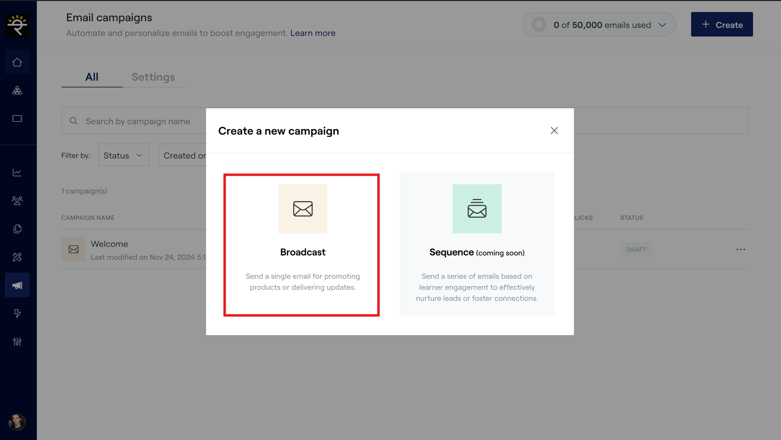 - Sequence (sequence is a series of automated emails sent based on learner engagement to guide them through courses, nurture leads, and foster connections)