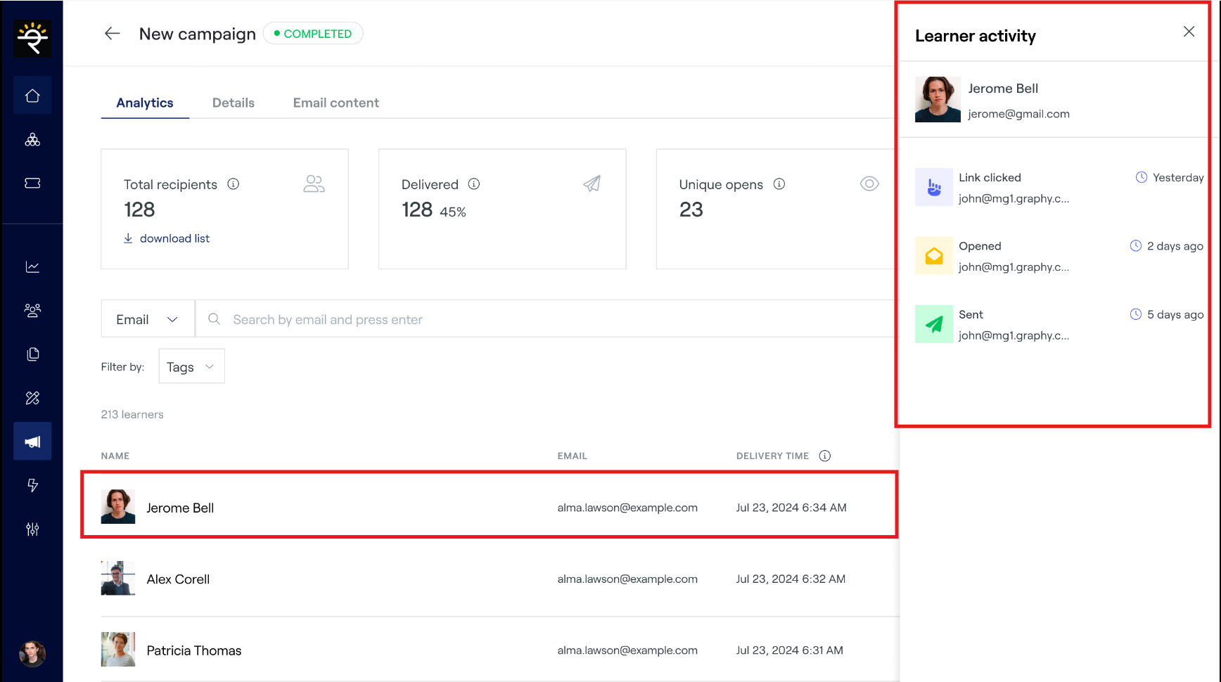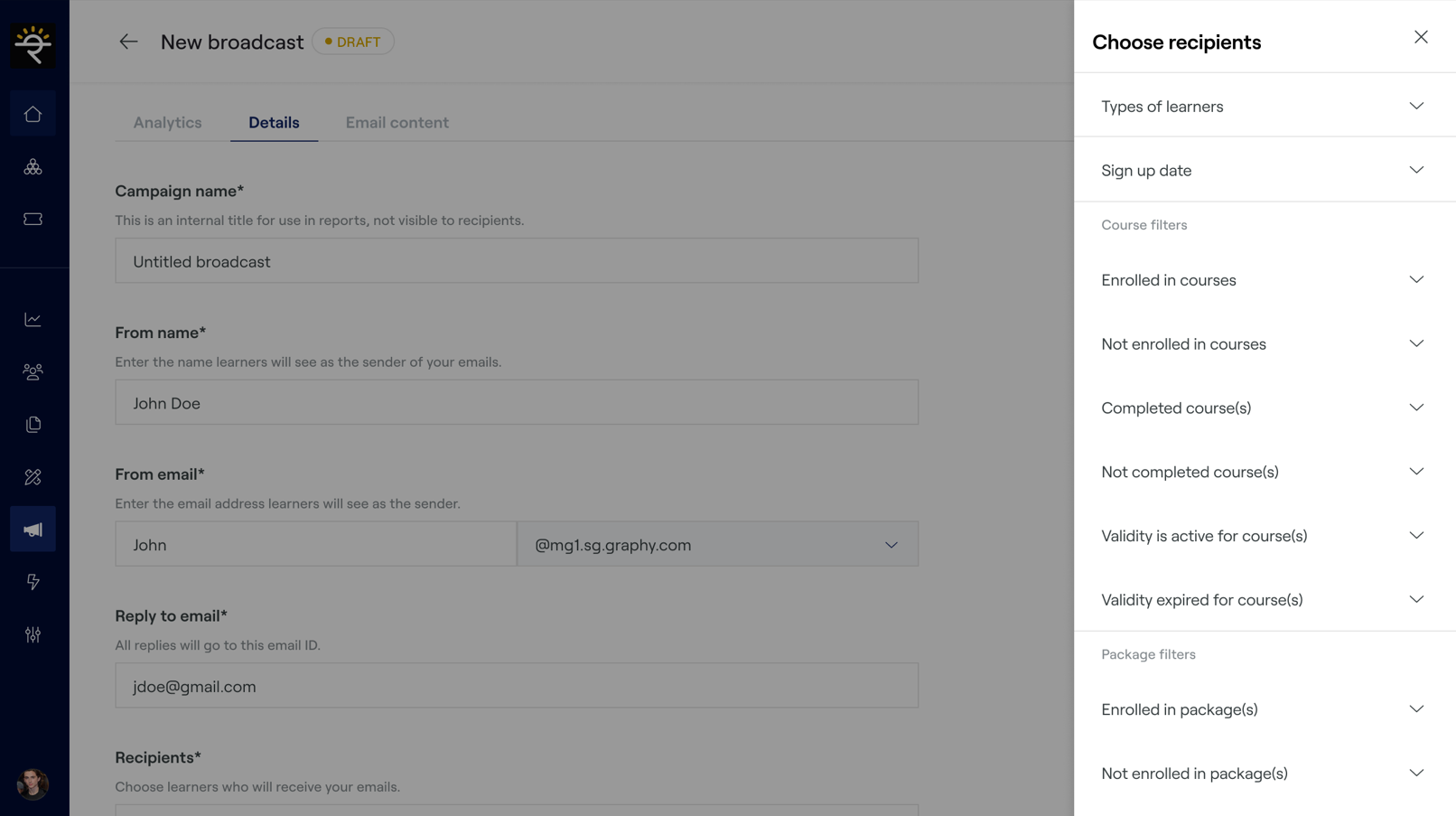 You can select your recipients from the right-side drawer, which offers various filters to refine your selection based on learner the activity/profile.