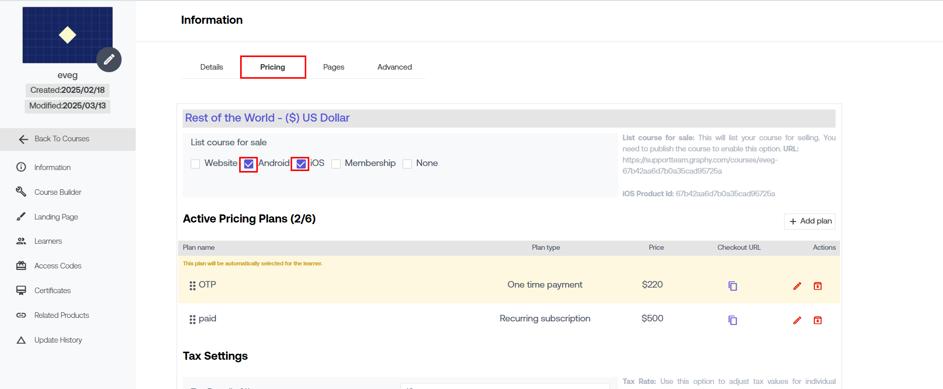 To make sure your course is visible on your apps as well, check the checkbox Android and iOS individually.