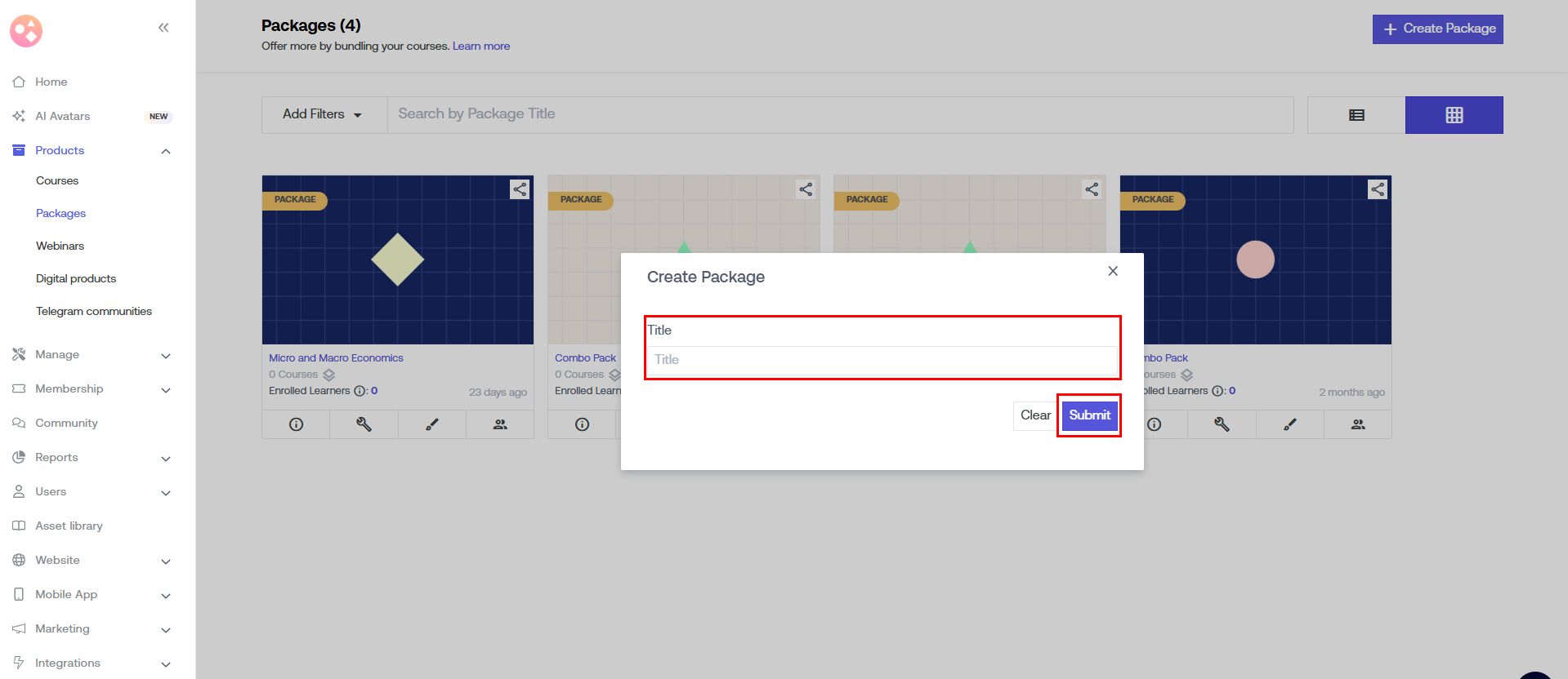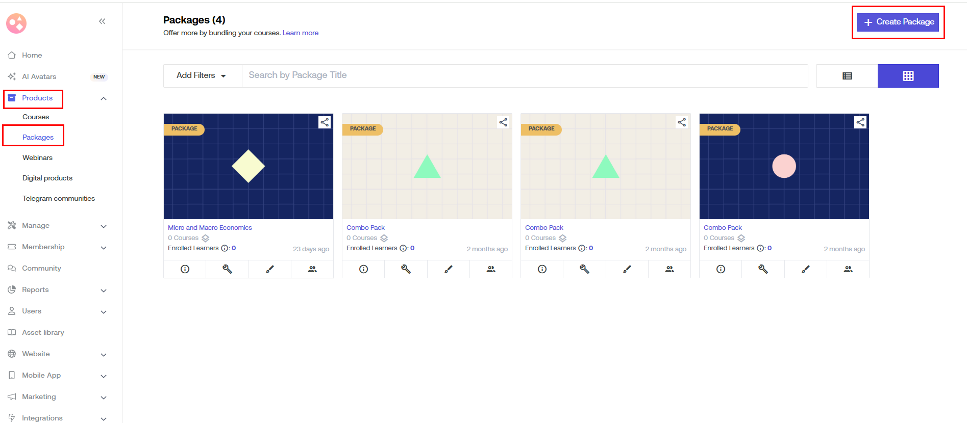 Go to Seekhly Dashboard > Left Navigation Panel > Products > Packages.
