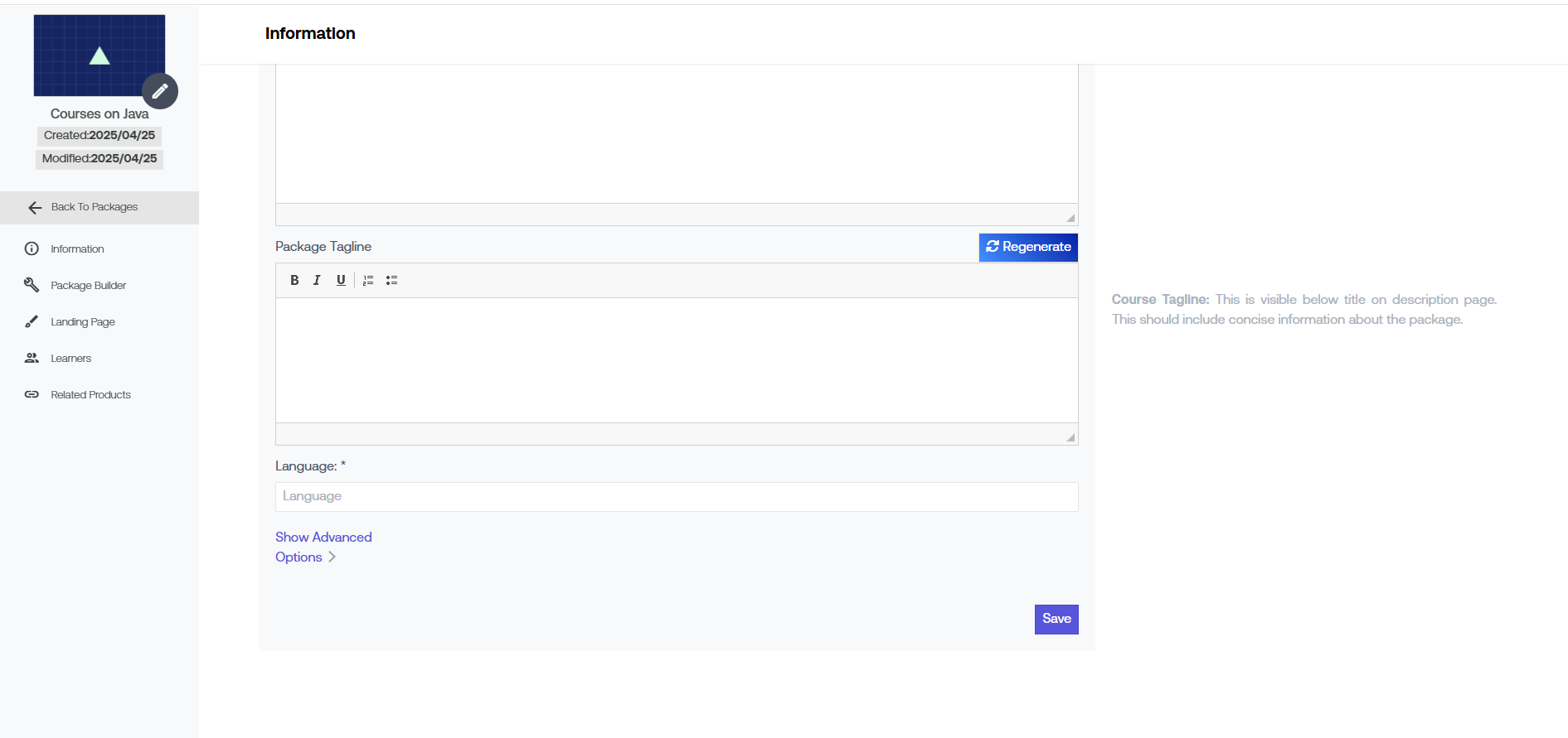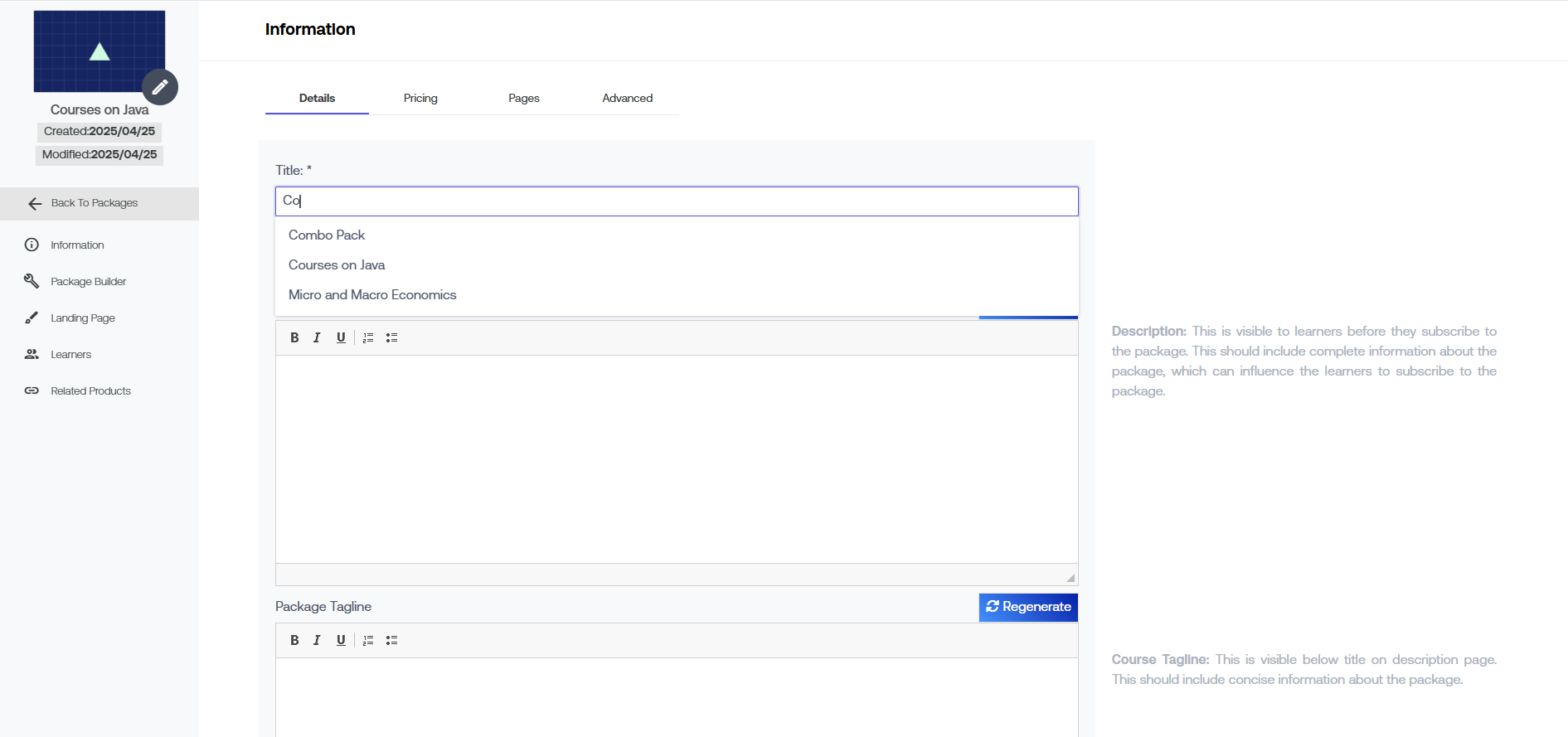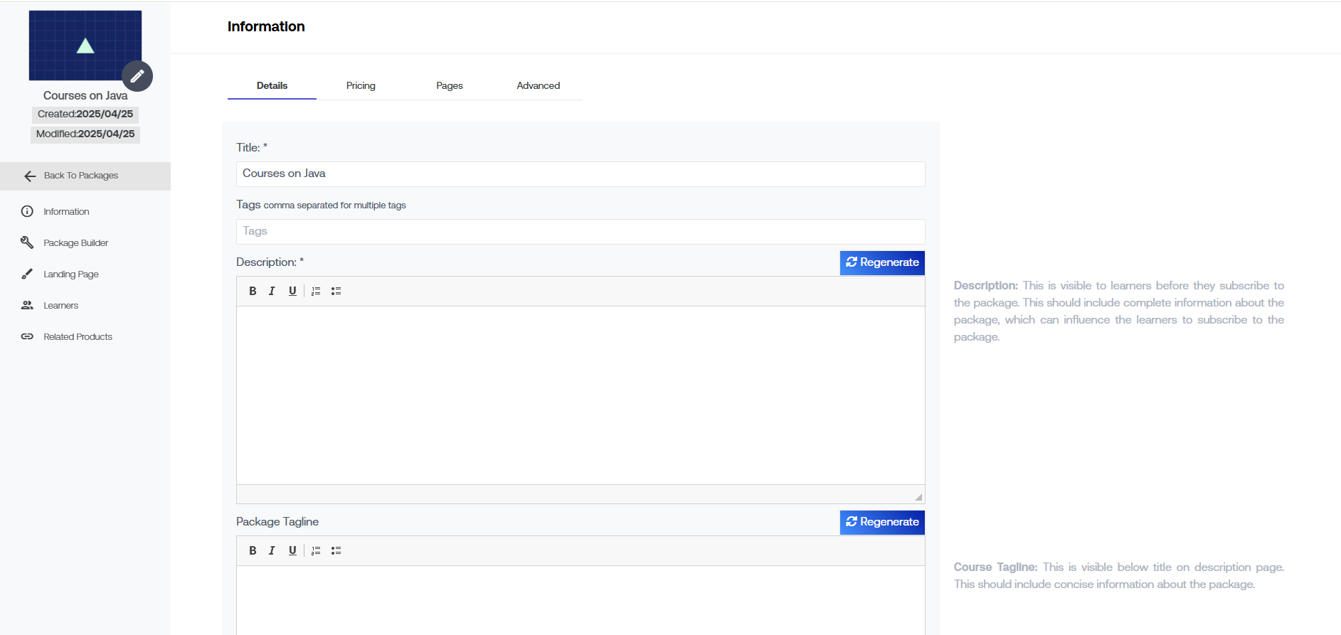 - Under "Details", generate the package description using the “Regenerate” AI feature.[This section provides complete information about the package to influence learners before subscribing].