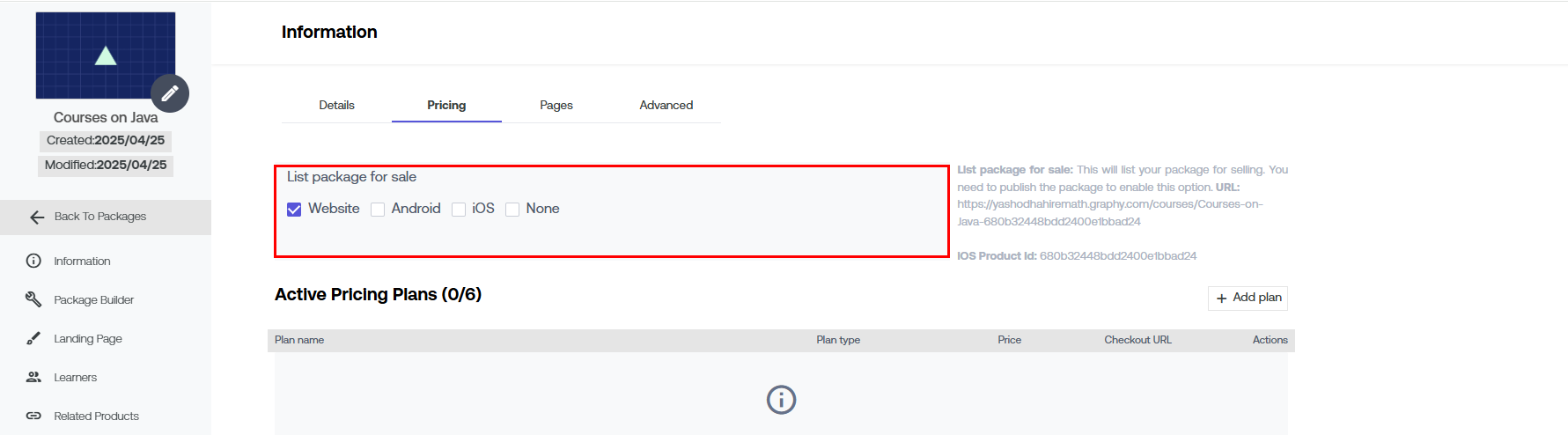 Under "List package for sale" and Check the boxes for the platforms where you want the package to be available for sale (Website, Android, iOS). If you do not want to list the package for sale immediately, select "None."This package would not be visible on your website
