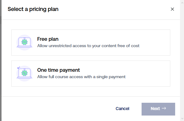 Under Pricing Plans to create a new plan click “Add plan”, now you will receive a “Select a pricing plan” pop-up and choose whether it is a “Free plan or One time payment” and click “Next”.