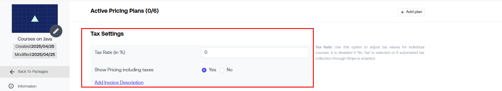 - Tax settings: If you want the tax rate to be shown click” Yes” if not then “No”.You can also customize invoice descriptions under tax settings.