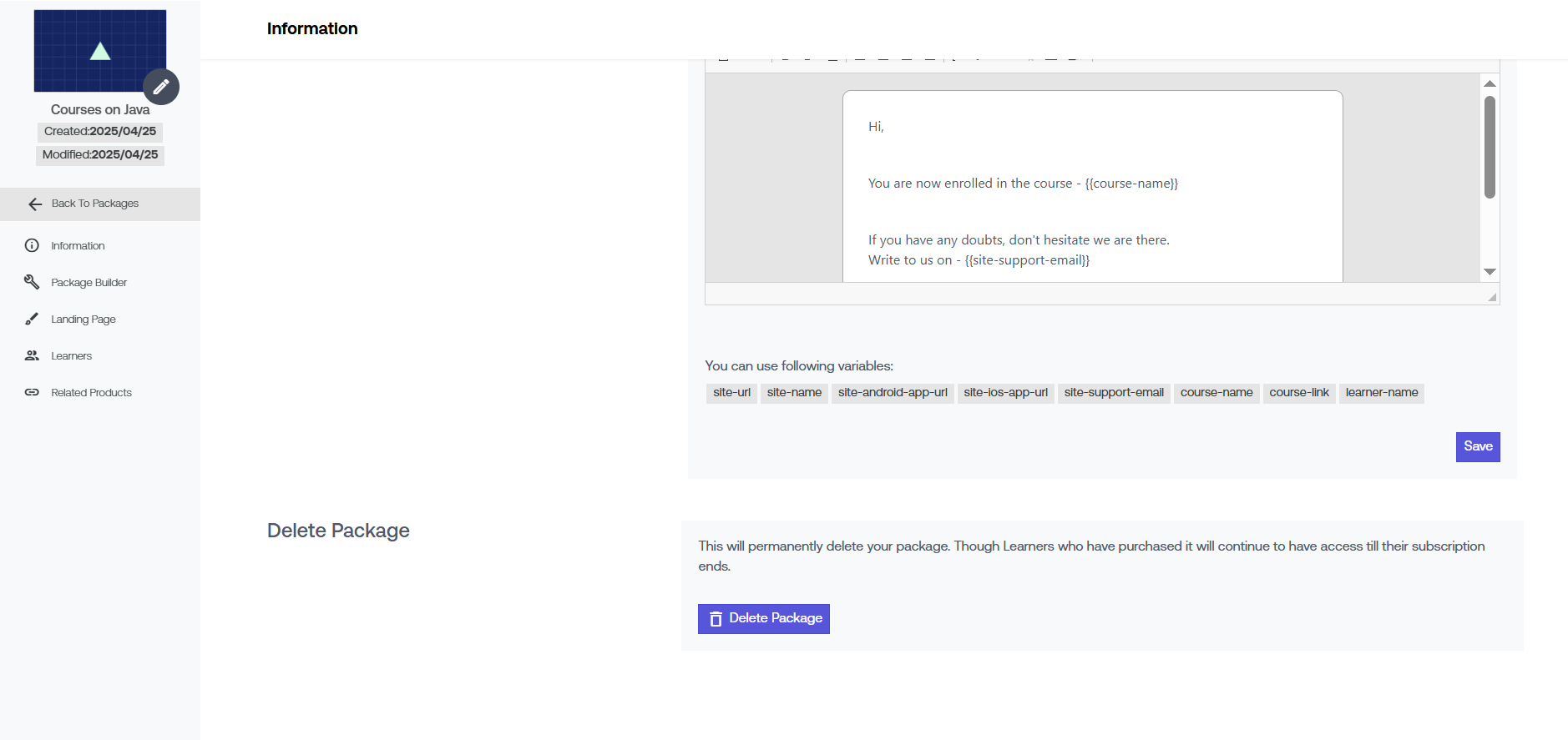 Here you can also Delete Package by clicking on the Delete “Package”.
