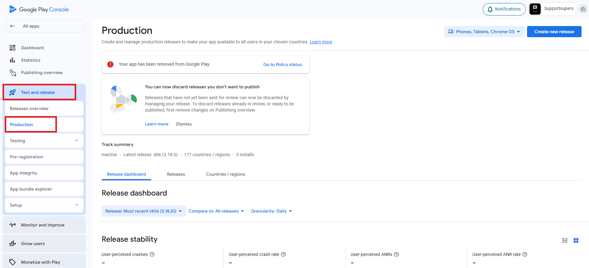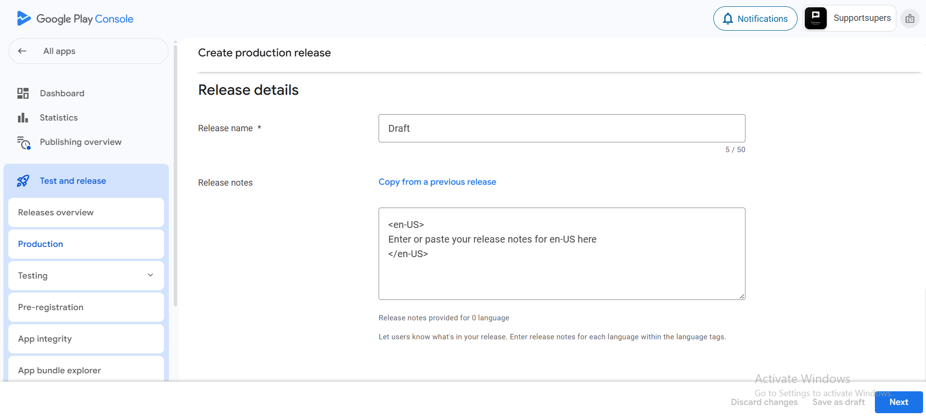Step 1 - Login to your play console account and open the newly created app which is in draft state currently. Now select Test and release > Production from the left navigation menu.