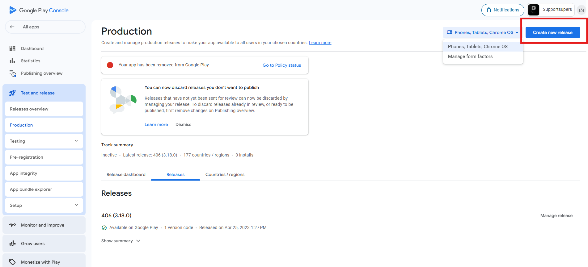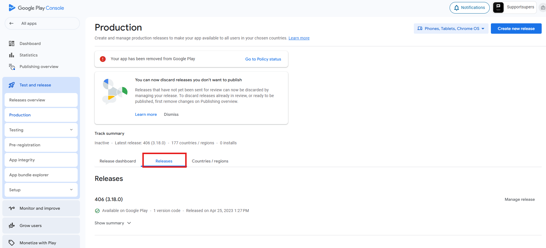 Step 2 -Select the ‘Releases’ tab and click on ‘Create new release’ button at top right corner.