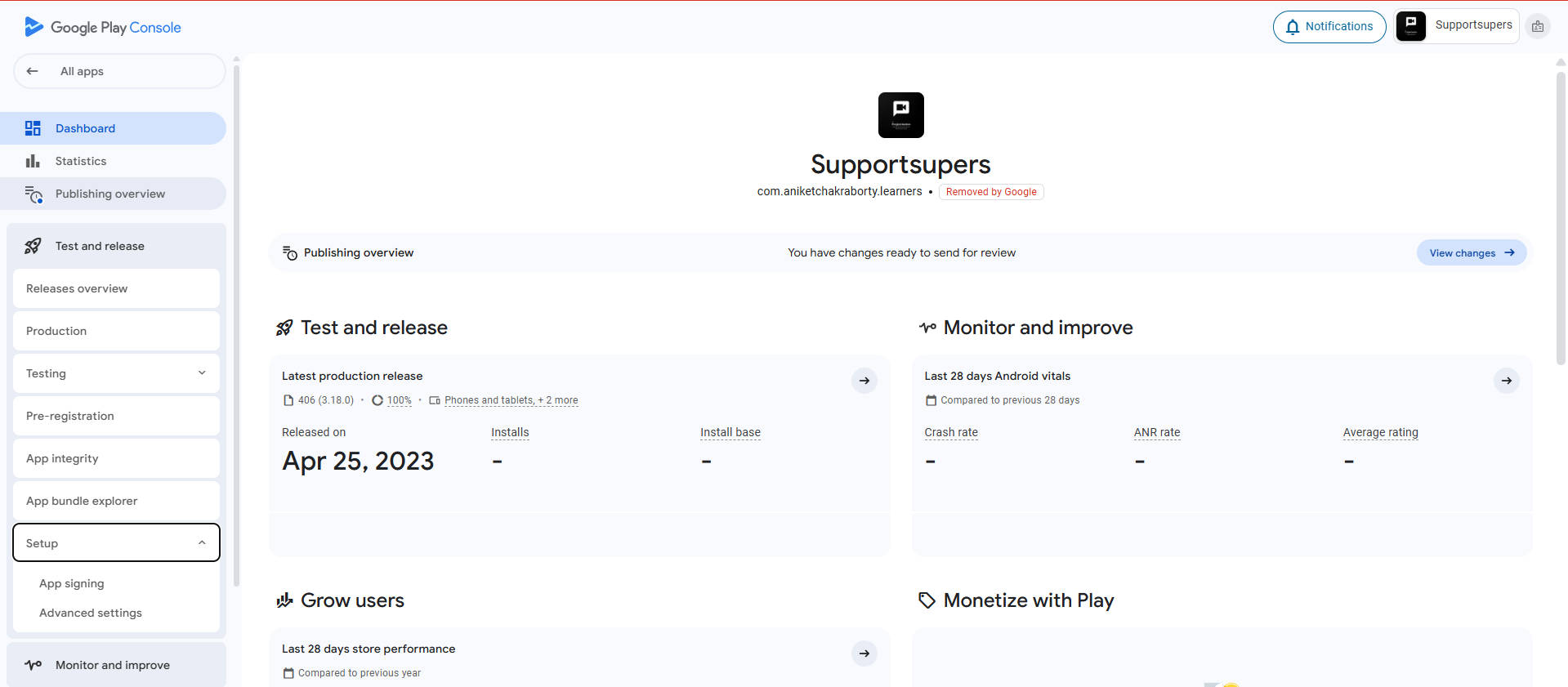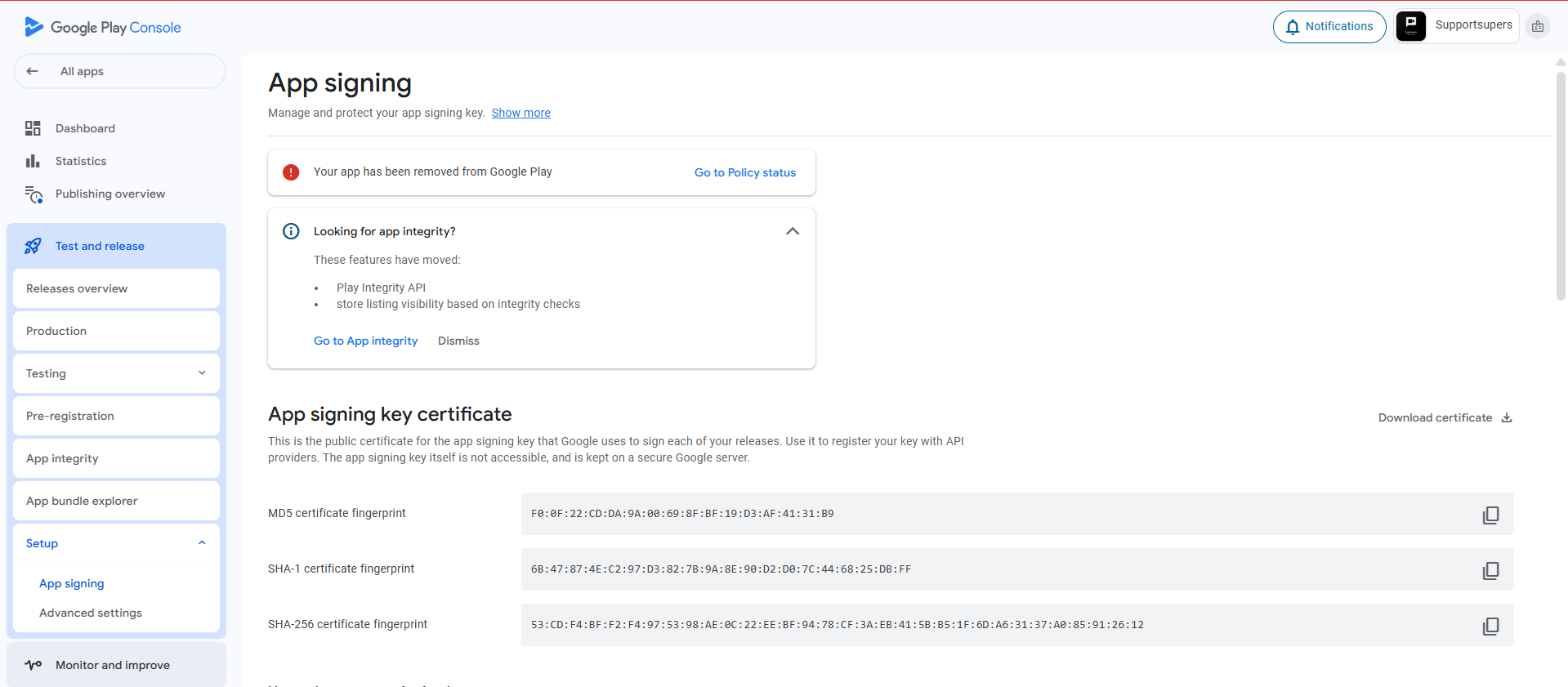 - Now, navigate to the Test and release sub-section from under the Setup section on the left-hand side menu and switch to the App Signing tab