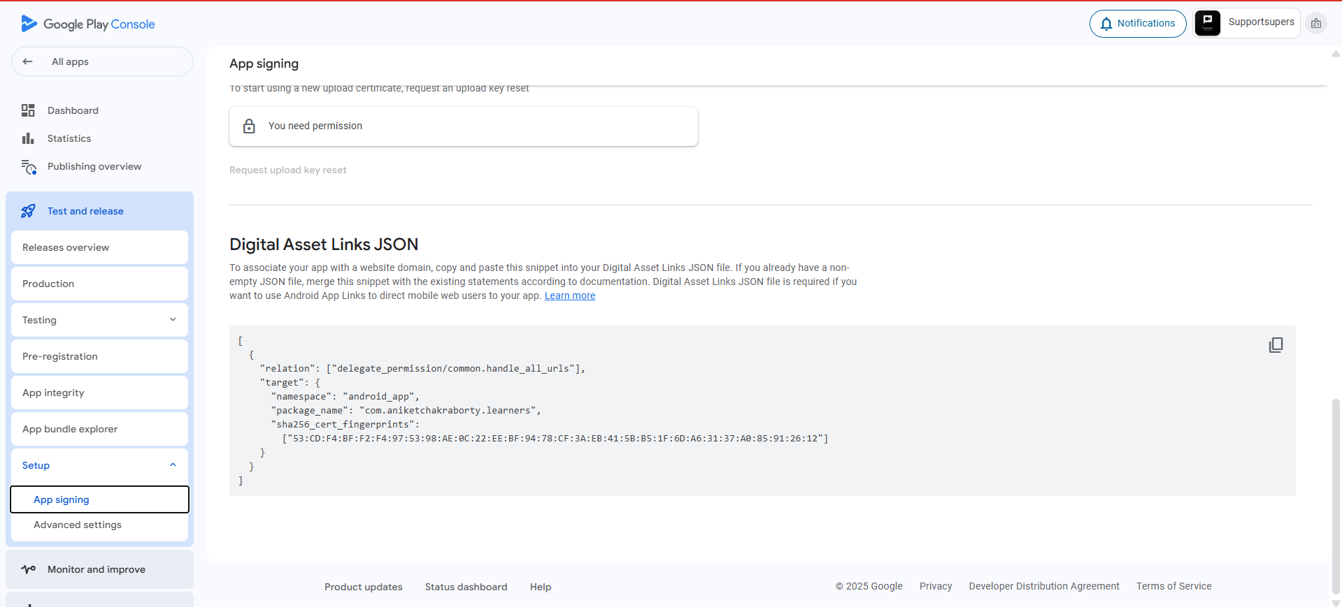 - Scroll down to the Digital Asset Links JSON section and copy the text content from under the section description.