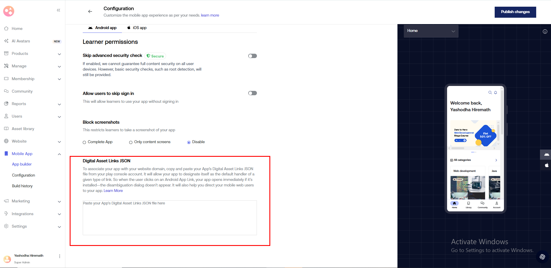 Now head back to your Seekhly Dashboard and navigate to the App Builder from under the Website & Apps section of the side menu. Click on the App Settings button and scroll down to the Digital Asset Links JSON section under the Android app tab to paste the copied content into the textbox provided.
