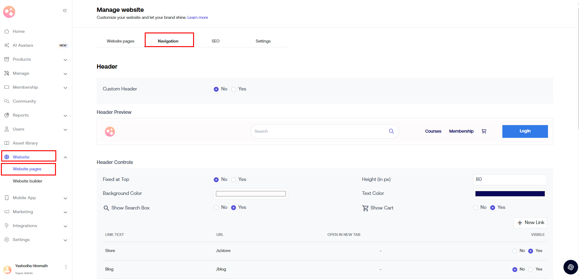 Customizing the social media handles on your footer is extremely easy. Simply go to 'Website' > 'Website Pages' from the left navigation and then click on the 'Navigation' tab.