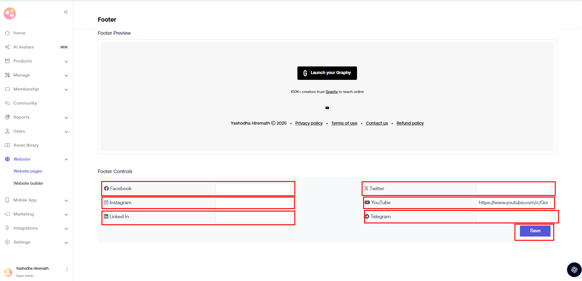 Scroll down to the section that says 'Footer'. Under 'Footer Controls' you can add direct links to your Facebook, Instagram, LinkedIn, Twitter, and YouTube accounts.