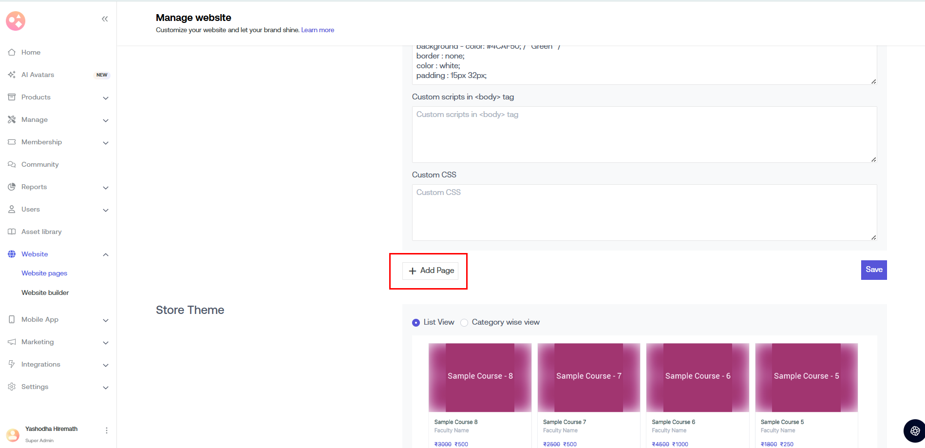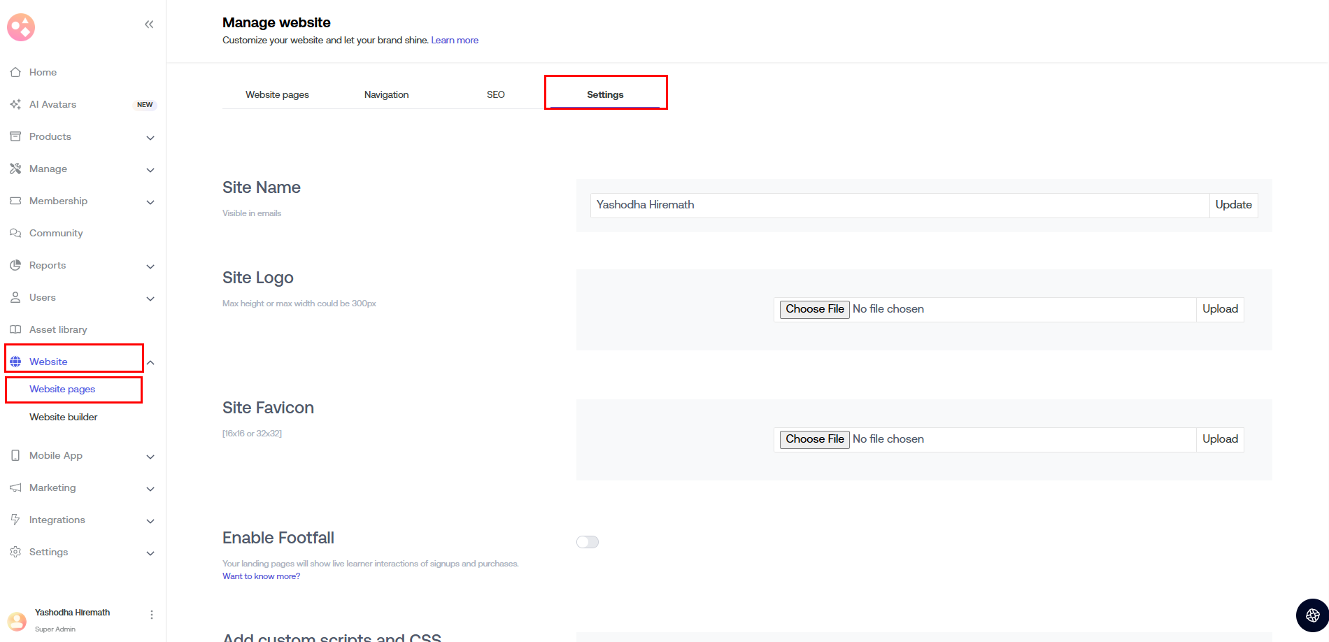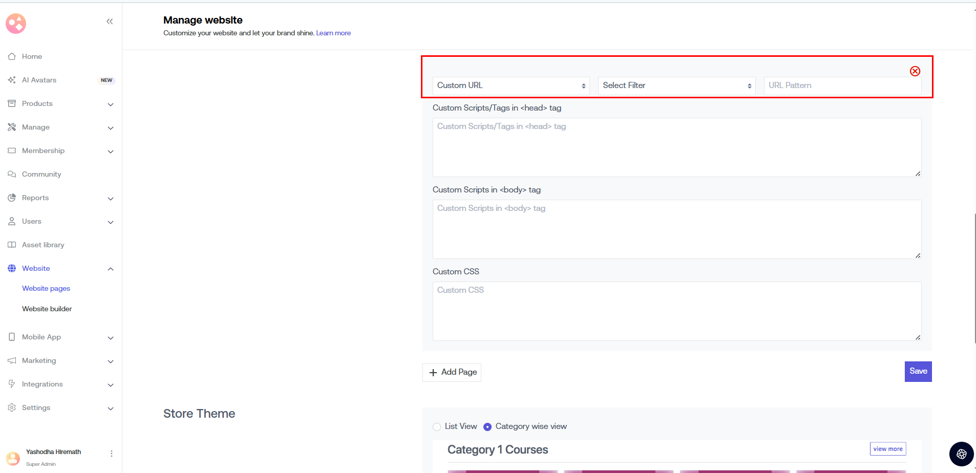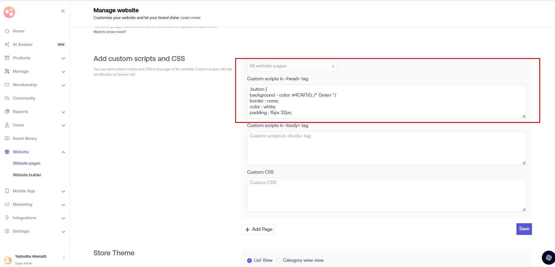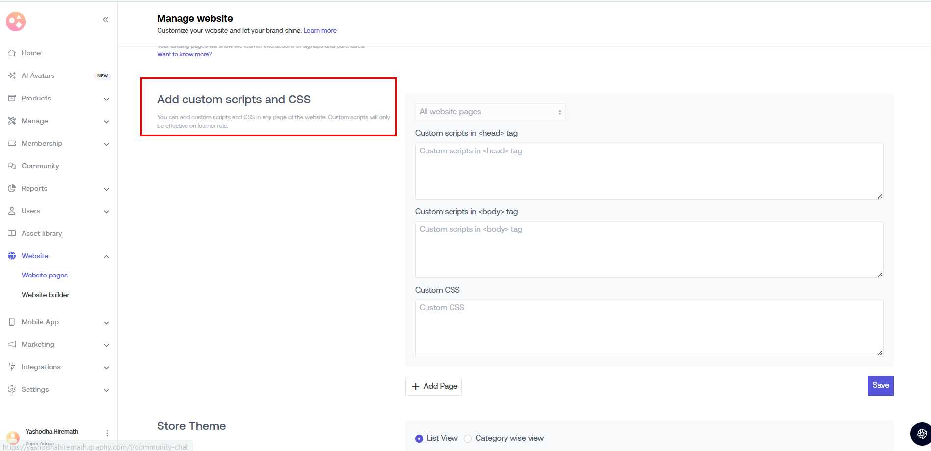 a) All Website Pages: The custom scripts that you add here go to all the web pages on your course platform.