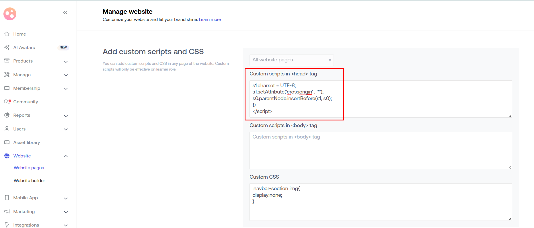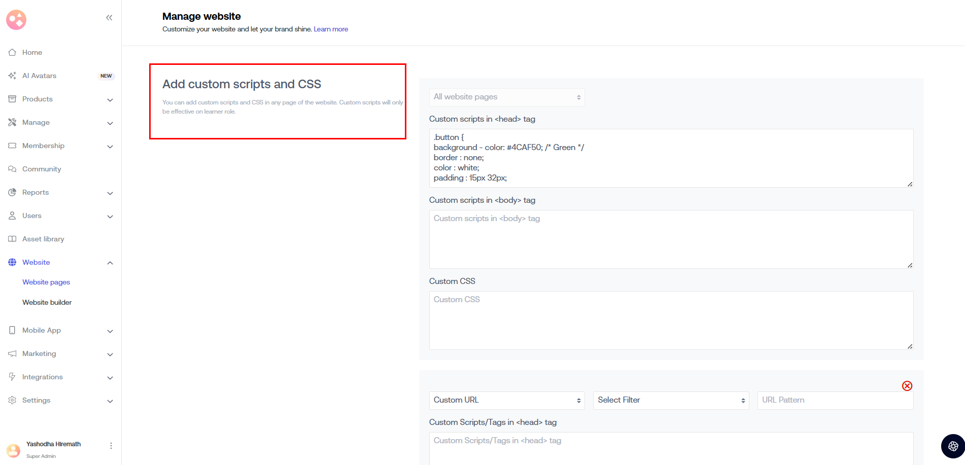 Now, you need to enter the script that you have copied under the Custom Scripts/Tags in head tag.