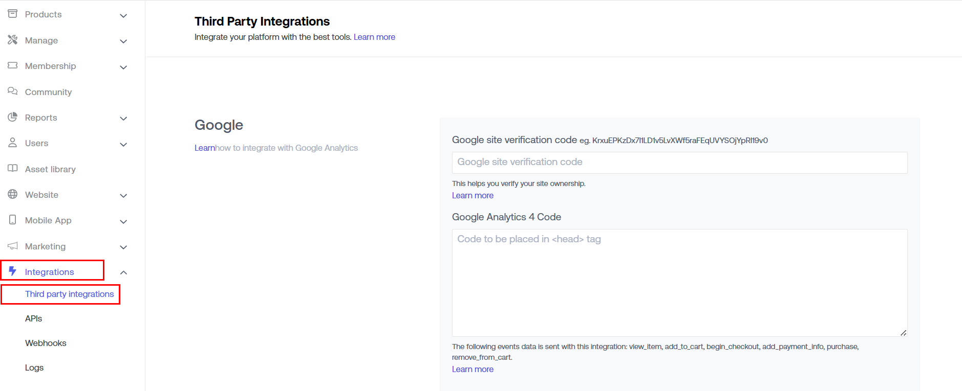 Log in to your Dashboard > Integrations > Third Party Integrations