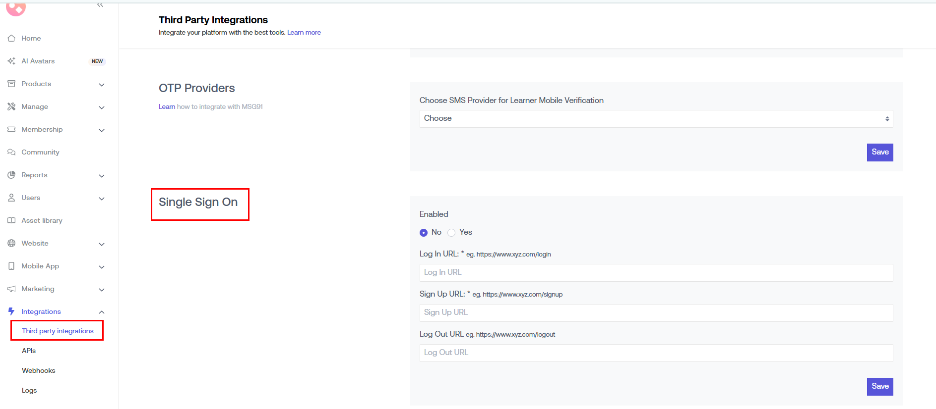 Often when using SSO, you will want your learners to use login, logout, and sign-up on your existing website. On Seekhly, you can enter the existing URLs of your login and sign-up page. You can find these options under Integrations Third Party Single Sign On.