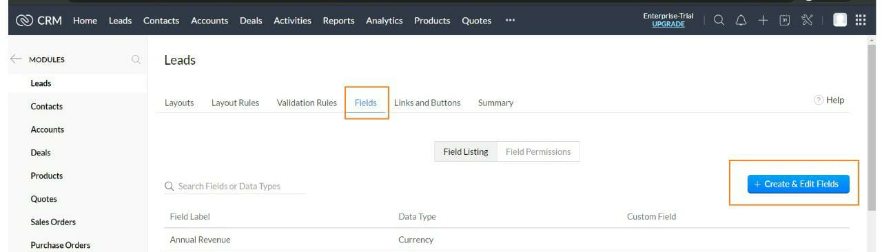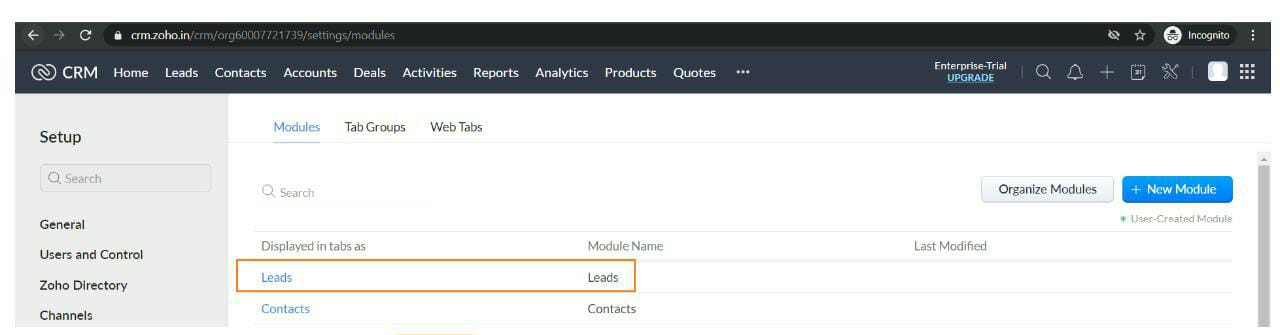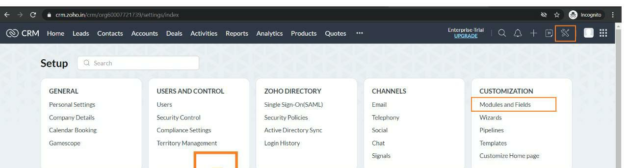 Now, click on the Settings icon from the menu bar & select "Modules & Fields" under "CUSTOMISATION".