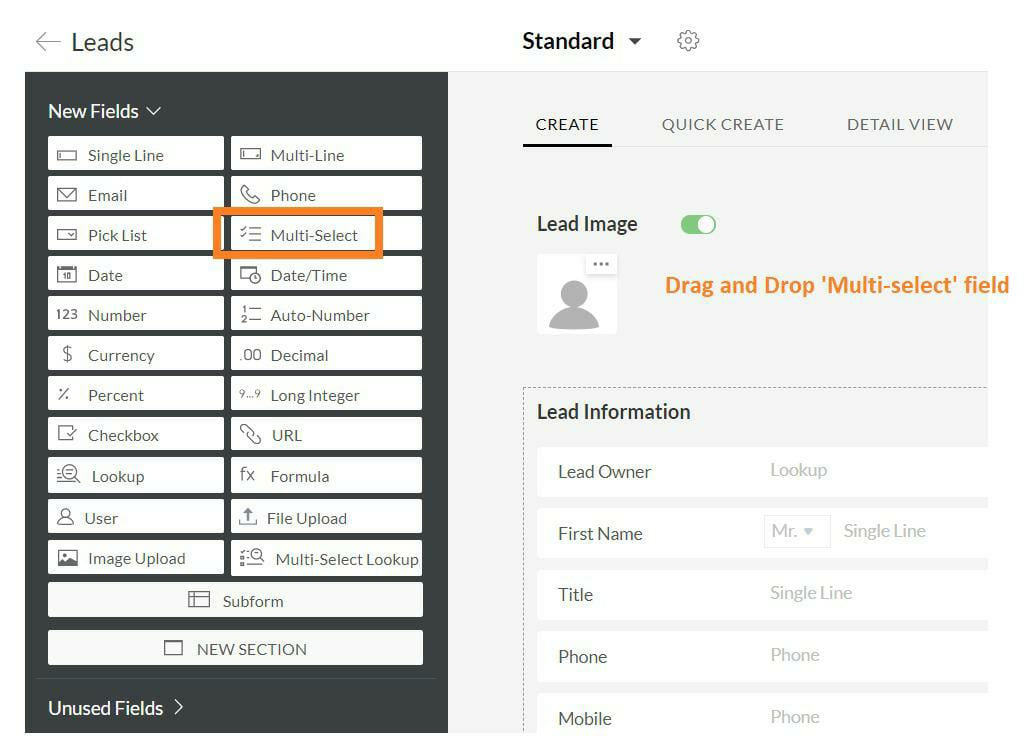 Under Leads, drag & drop the "Multi-Select" field. The "Lead Information" are the details which your lead will provide.