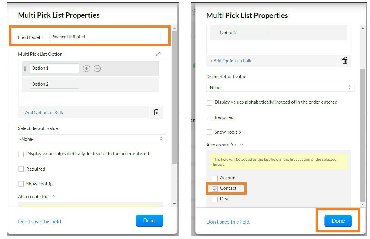 A box will open. Under Multi Pick List properties, enter the Field Label as "Payment Initiated". Please note that the Field Label is case-sensitive.