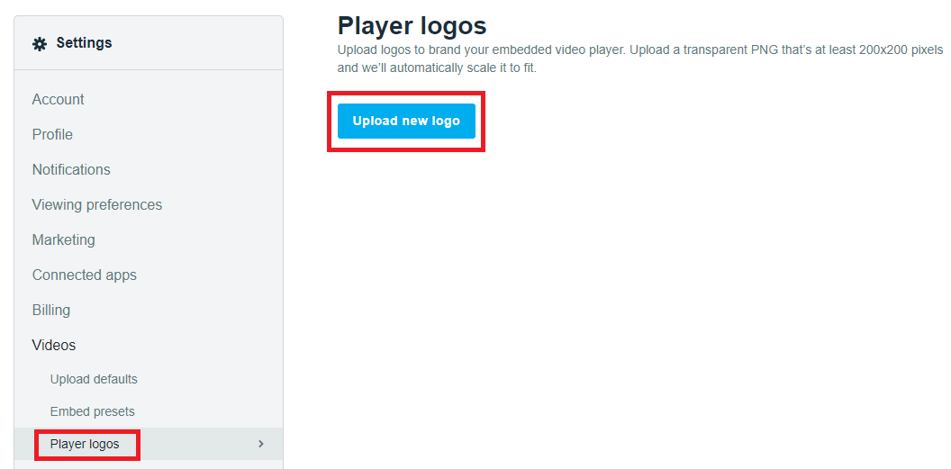 Finally, if you want to upload a custom logo, just click on “Player Logos” under “Videos”. Click on “Upload new logo”, upload your custom logo & It’s done.