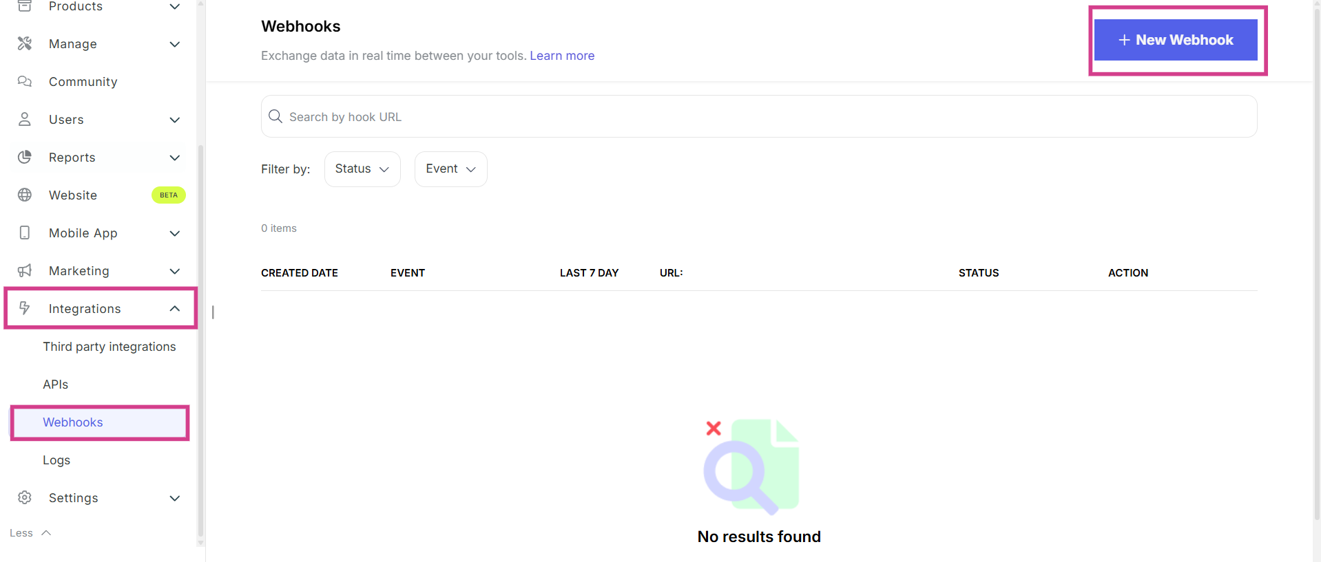 Login to your Dashboard> Integrations> Webhooks