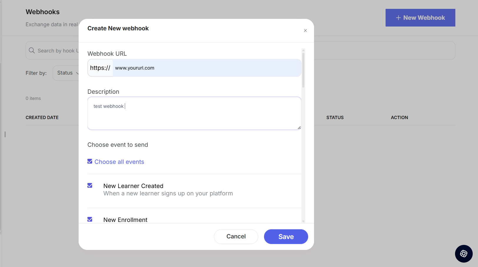 Example: If you have created a webhook to get the notification every time when a new learner signs up then you can write about it here.