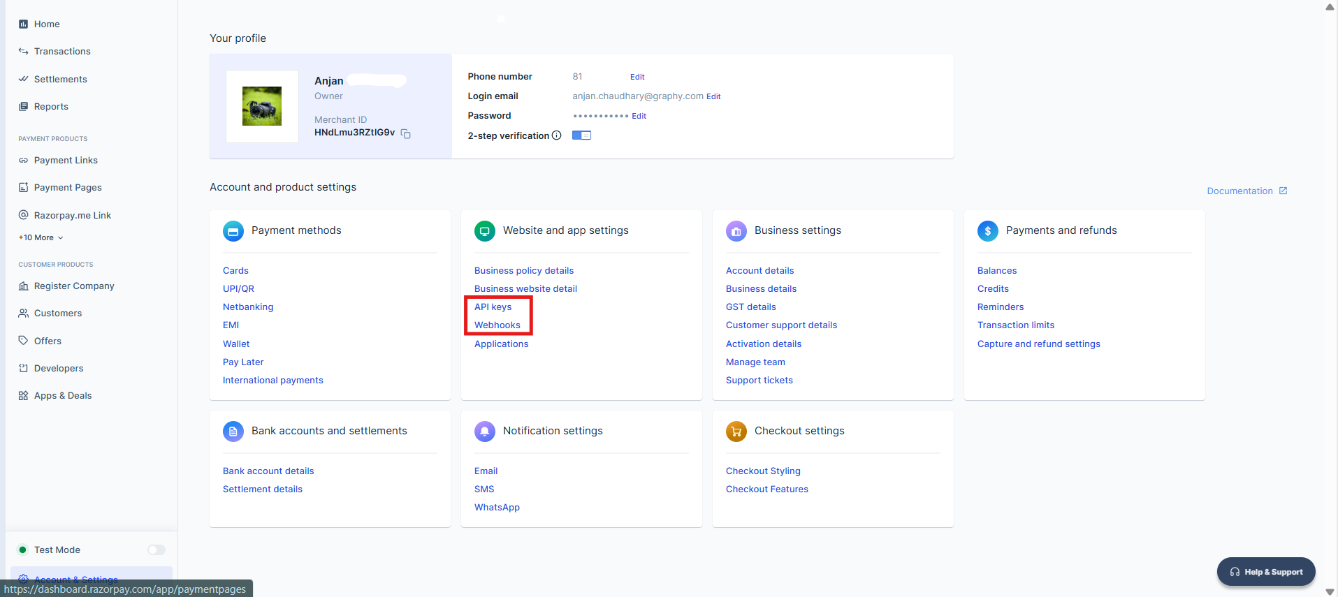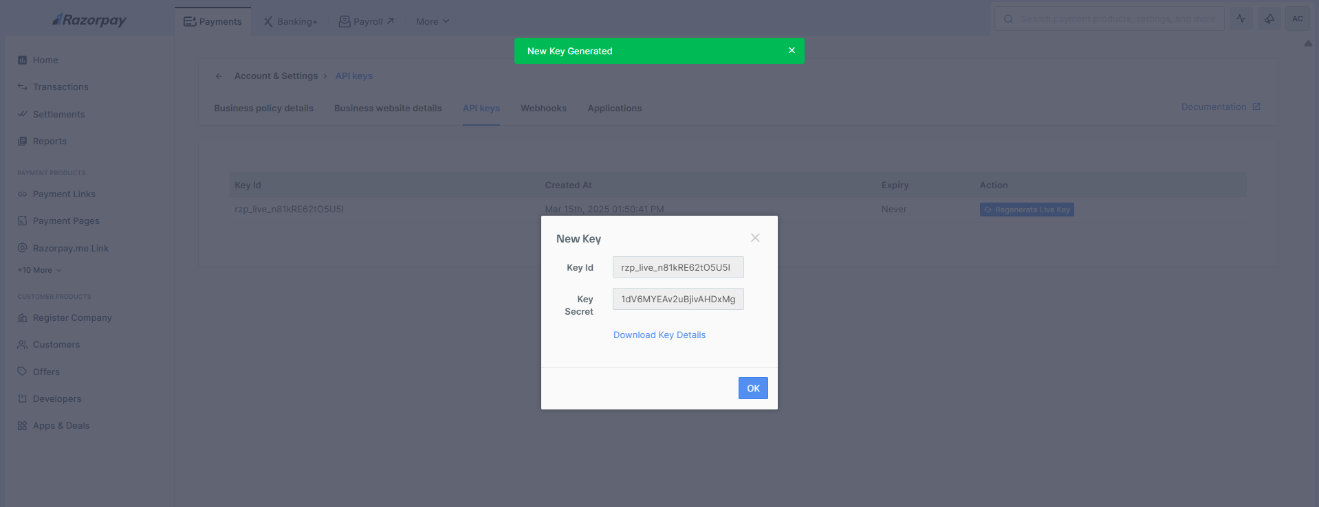 Click on "API Keys" from your tab. Here you will get the private keys using which you will integrate the Razorpay into your course platform.