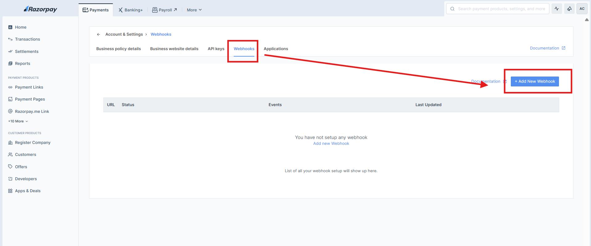 Go back to the Razorpay tab you have left open. Here, paste Webhook URL & Secret that you have copied.