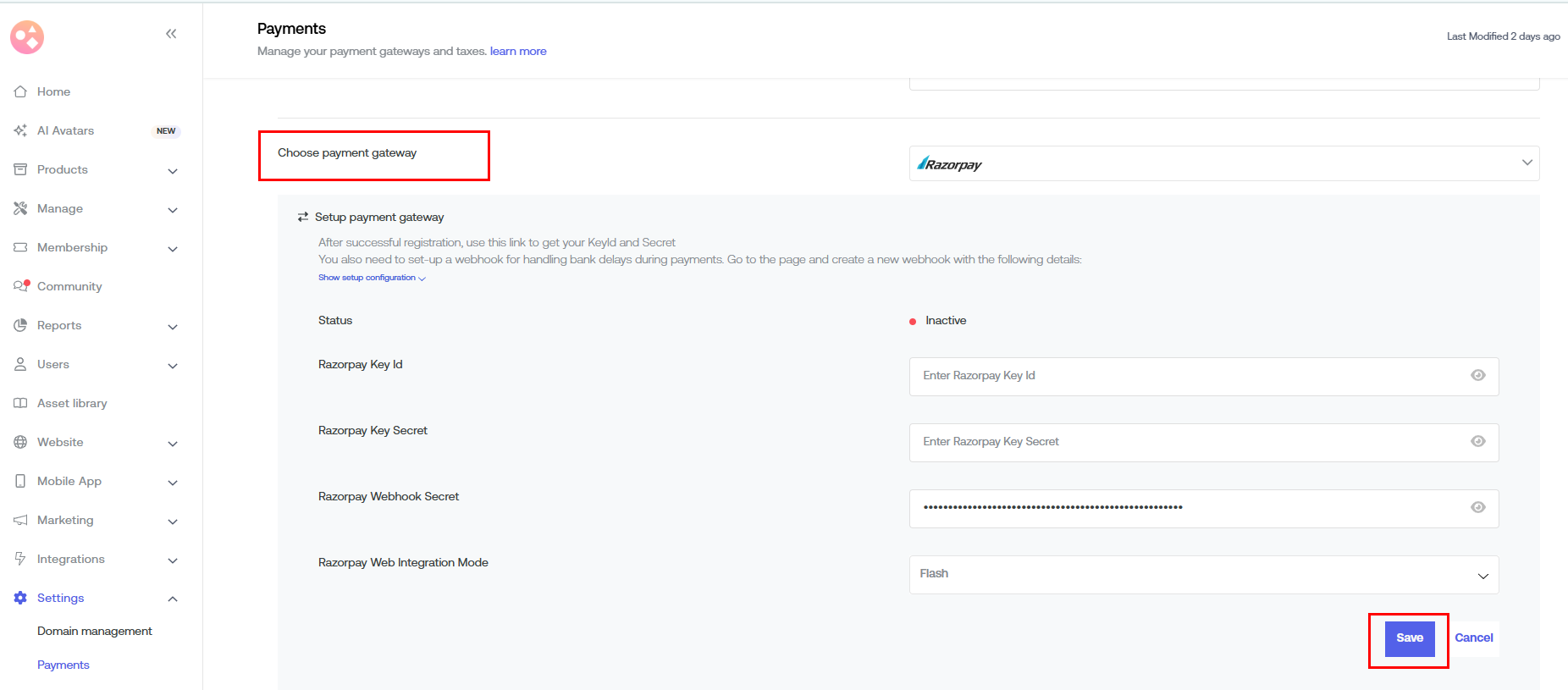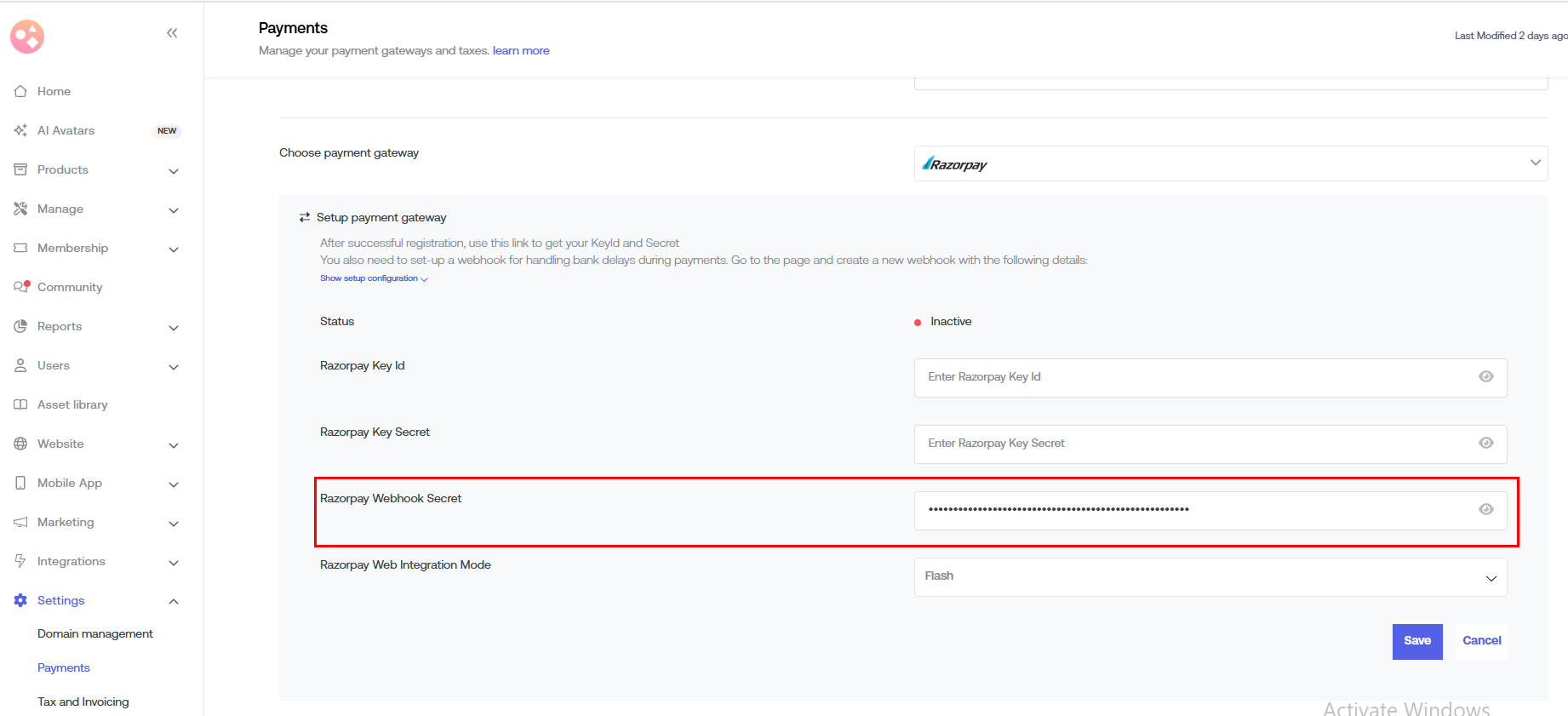 Go back to your Course Platform where you have last left. Now paste RazorPay Key Id & Key Secret in here.
