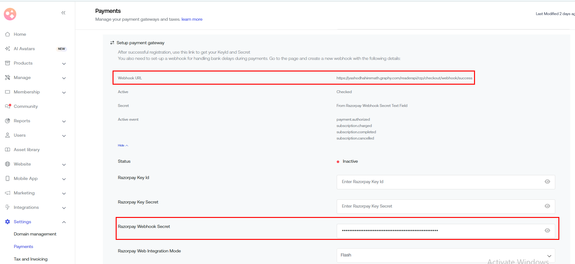 Now, scroll down till the Private Keys details under the "Payment Gateway Details". From here copy the “Razorpay Webhook Secret”. From the right side of the webpage, copy the “Webhook URL”