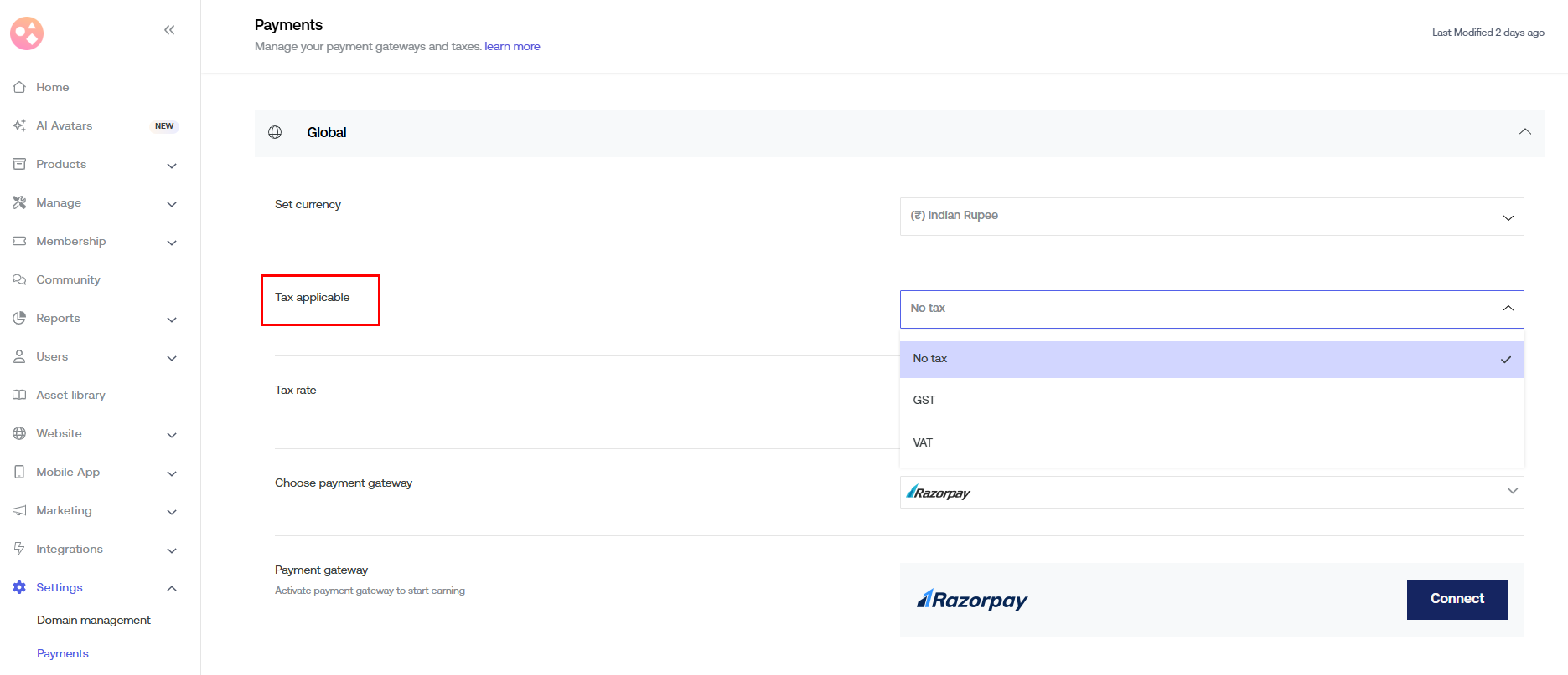 Under the "Payment Gateway" select "RazorPay". If you want to charge tax, click on "GST", "VAT" or click on "No Tax". If you want to charge tax, enter the percentage charged under "Default Tax Rate".