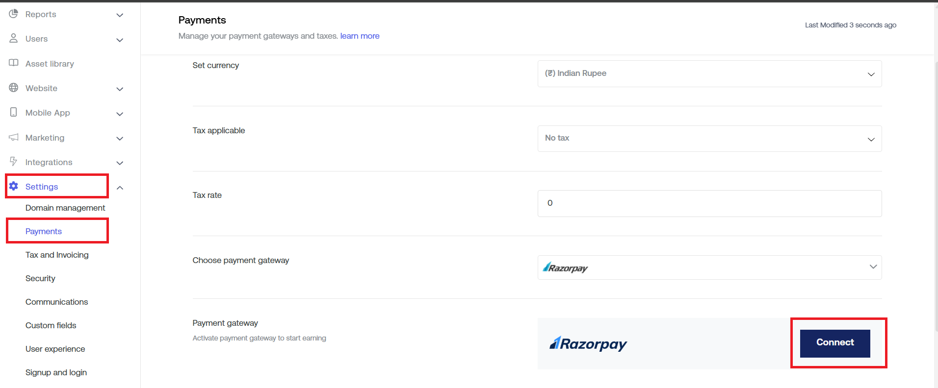 Scroll down to Choose Payment Gateway > Razorpay > click Connect.