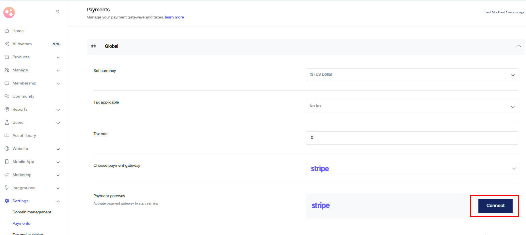 To activate the Payment gateway click Connect.
