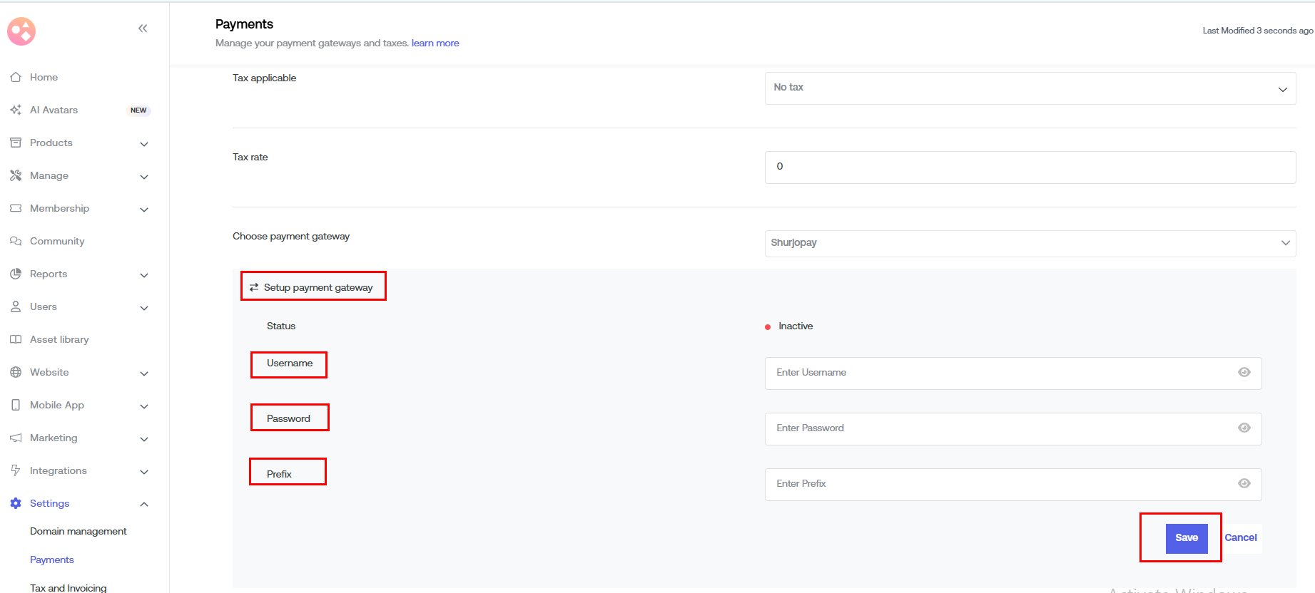 Scroll down to 'Payment Gateway Details'. Shurjopay will send you an email with the details for Username, Password, and Prefix. Add them and click on 'Save'.