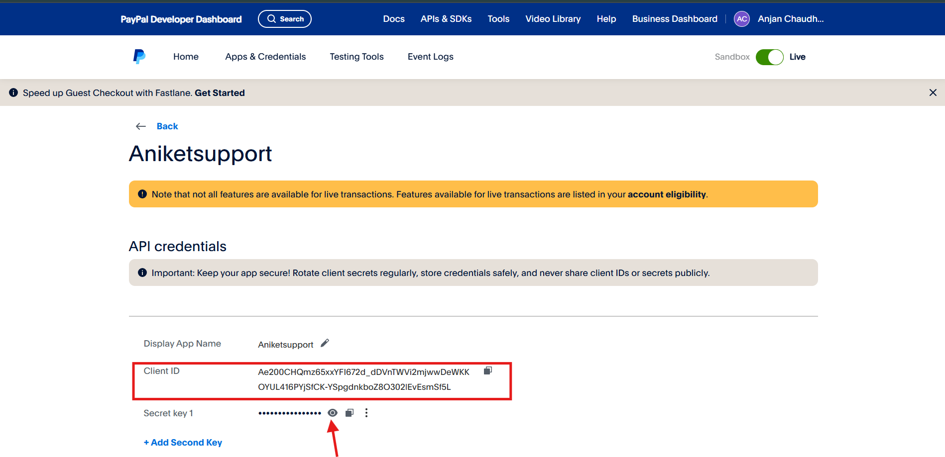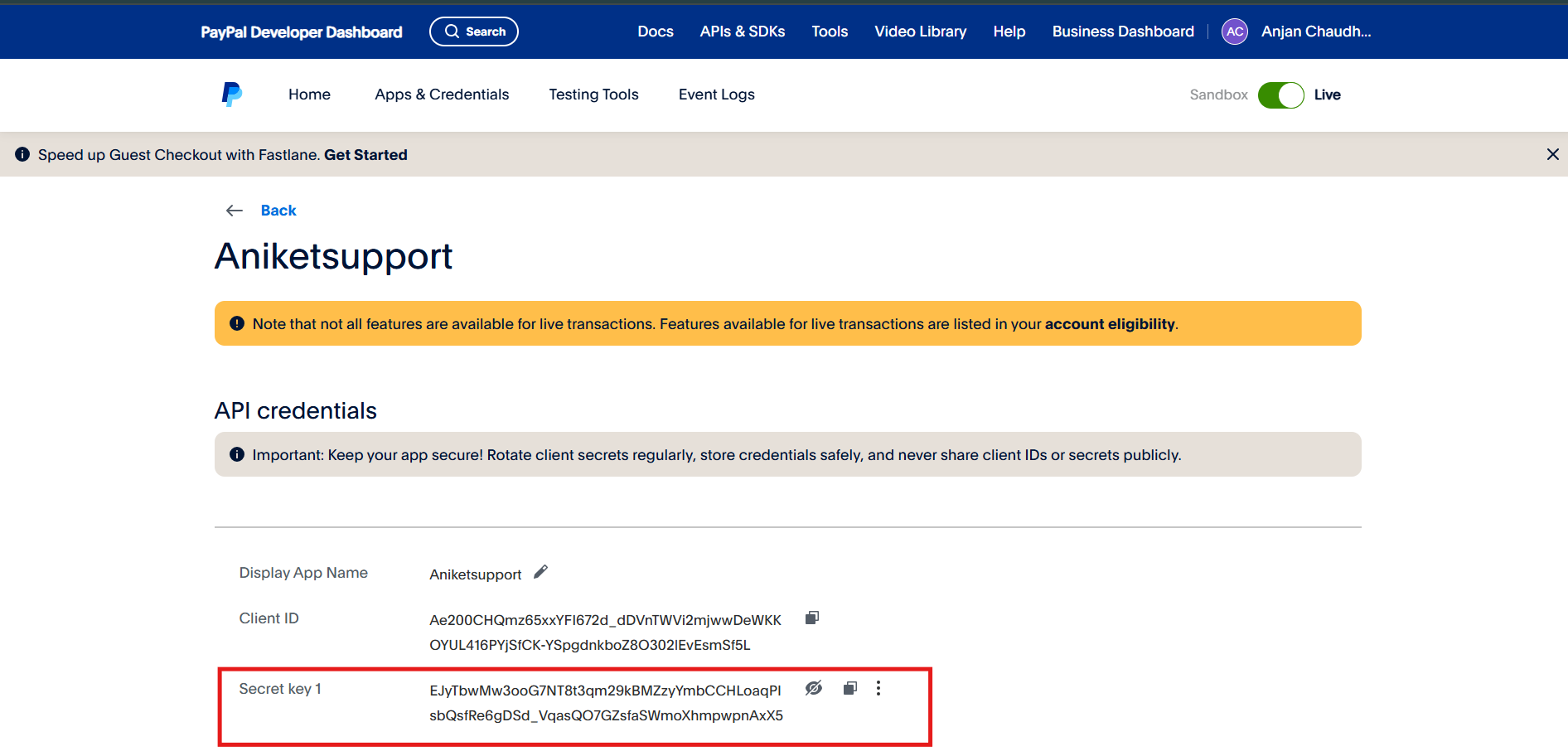 Copy the Paypal Secret Key.